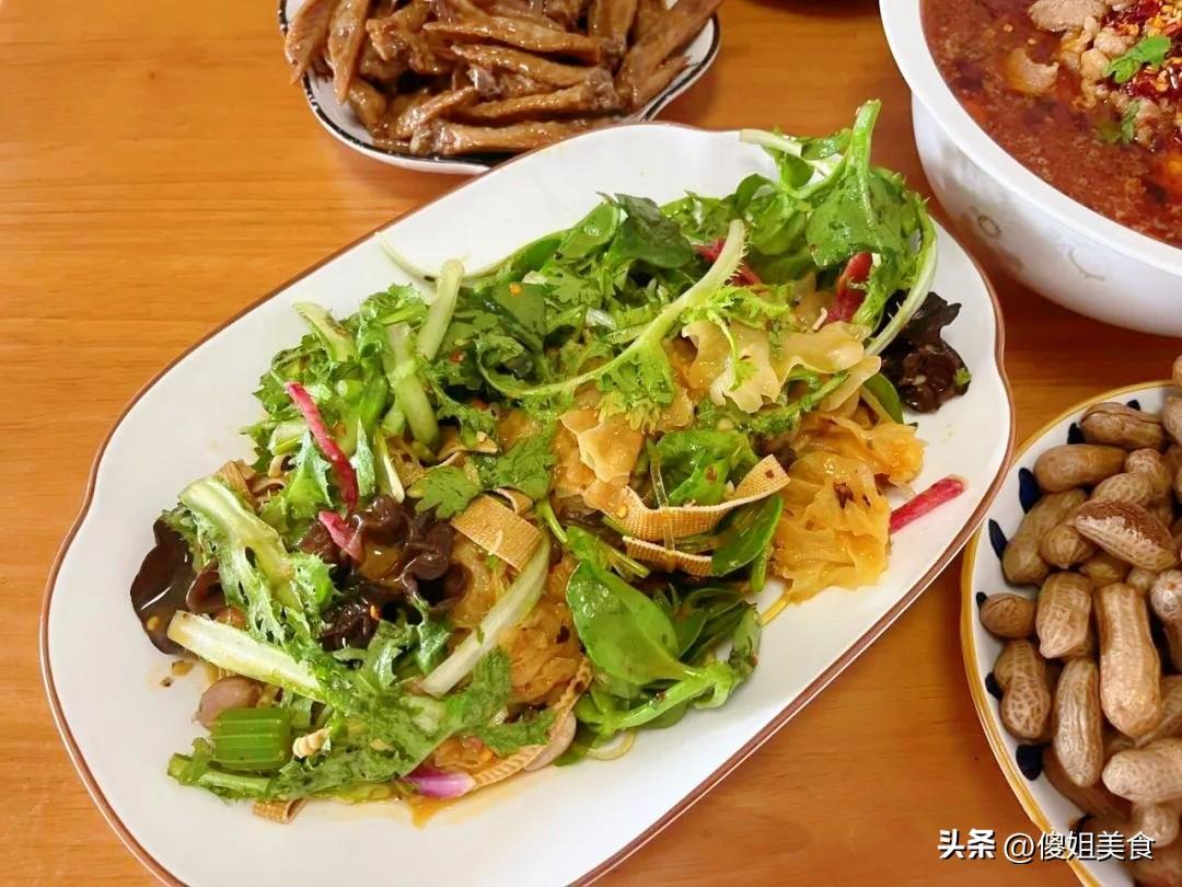 油豆皮和木耳焯一下水,撈出涼涼,然後和手撕的苦菊、切絲的洋蔥放在一起。鍋裏燒點熱油,把幹辣椒段炸出香味,趁熱“呲啦”一下潑在菜上,再加鹽拌勻。簡單吧?但味道層次很豐富,豆皮的豆香、苦菊的微苦回甘、洋蔥的甜辣、木耳的脆爽,再加上那一點恰到好處的熗辣味,絕了。