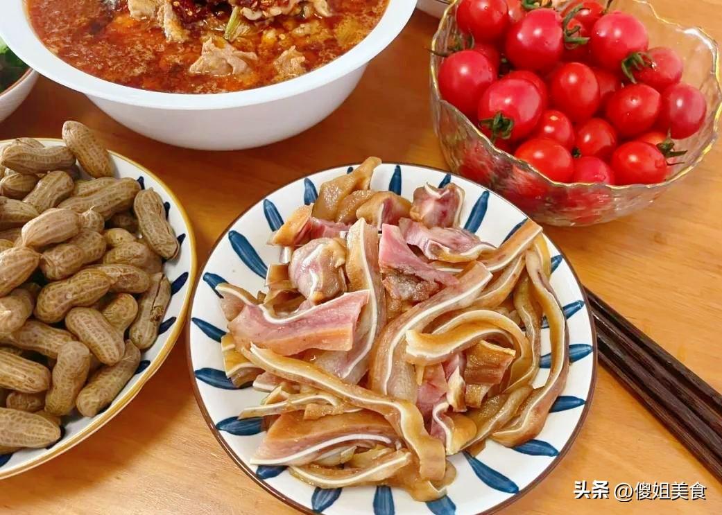 我家附近有一家開了十幾年的特色熟食店,他家的滷味是一絕。我特意早上去買的新鮮滷好的豬耳朵,油光鋥亮,滷香撲鼻。回來直接切成細細的條,裝盤上桌,就是一道超級受歡迎的下酒菜(雖然我們今天喝的是果汁)。口感彈牙,帶着滷汁的鹹香和一點點脆骨,嚼起來特別帶勁。
