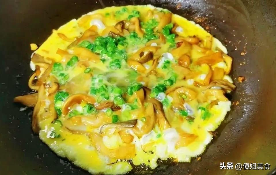 6、看到蛋液底部開始凝固,邊緣微微翹起時,用鍋鏟輕輕推動。這時候的雞蛋會和平菇自然地粘連在一起,形成漂亮的蛋花。等蛋液八成凝固時,再加入適量的鹽和少許味極鮮調味,快速翻炒均勻。看到雞蛋完全凝固,和平菇完美地融合在一起,撒上切好的蔥花,快速翻炒幾下,就可以關火裝盤了。