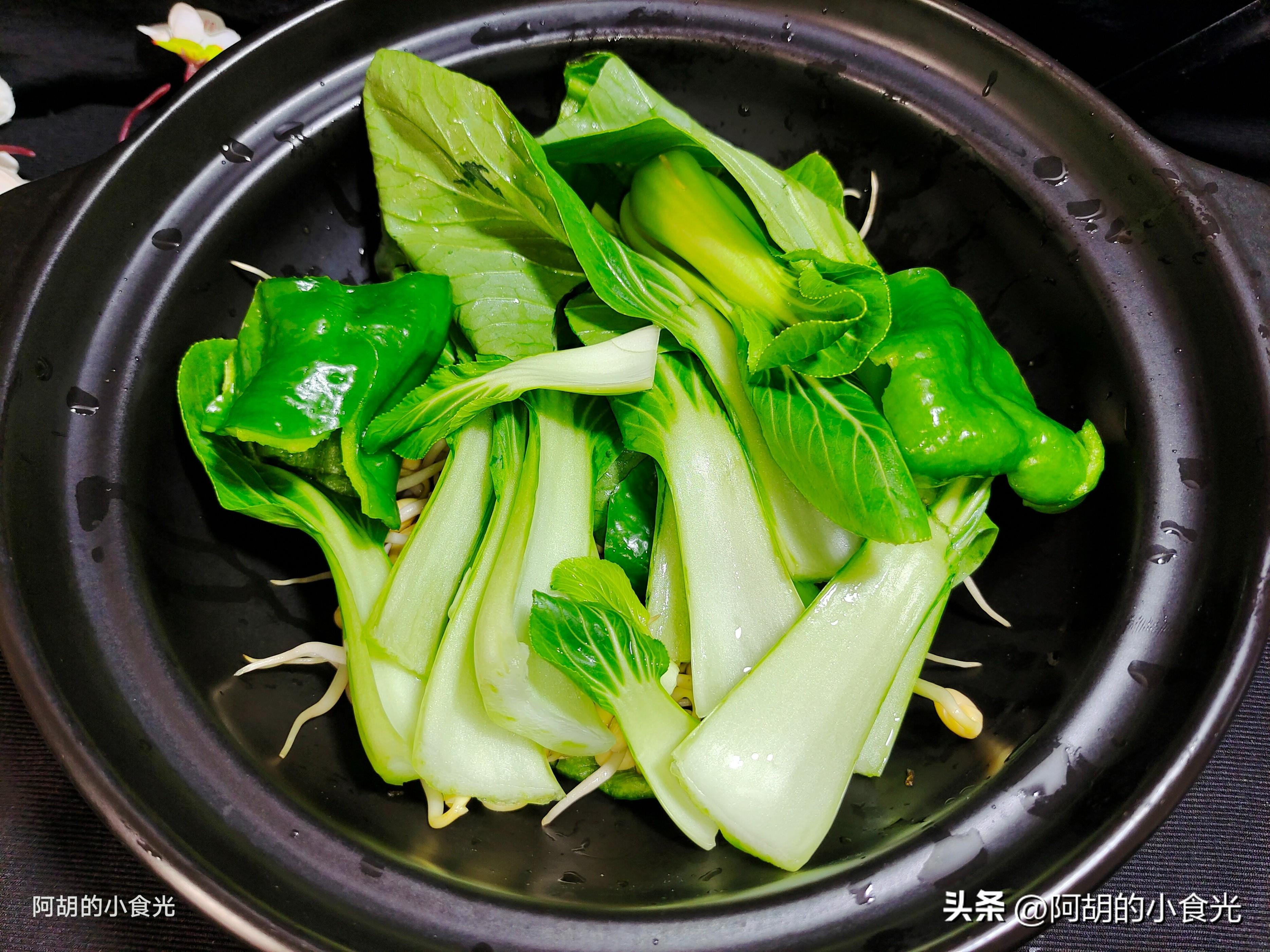 第三步:砂鍋素雞最好搭配一些蔬菜一塊喫,我這裏準備了一些大青菜、黃豆芽和兩個青椒,將這些蔬菜清洗乾淨後直接鋪在砂鍋的底部。而後取出擠幹水分的素雞,將其整齊地鋪在最上面待用。