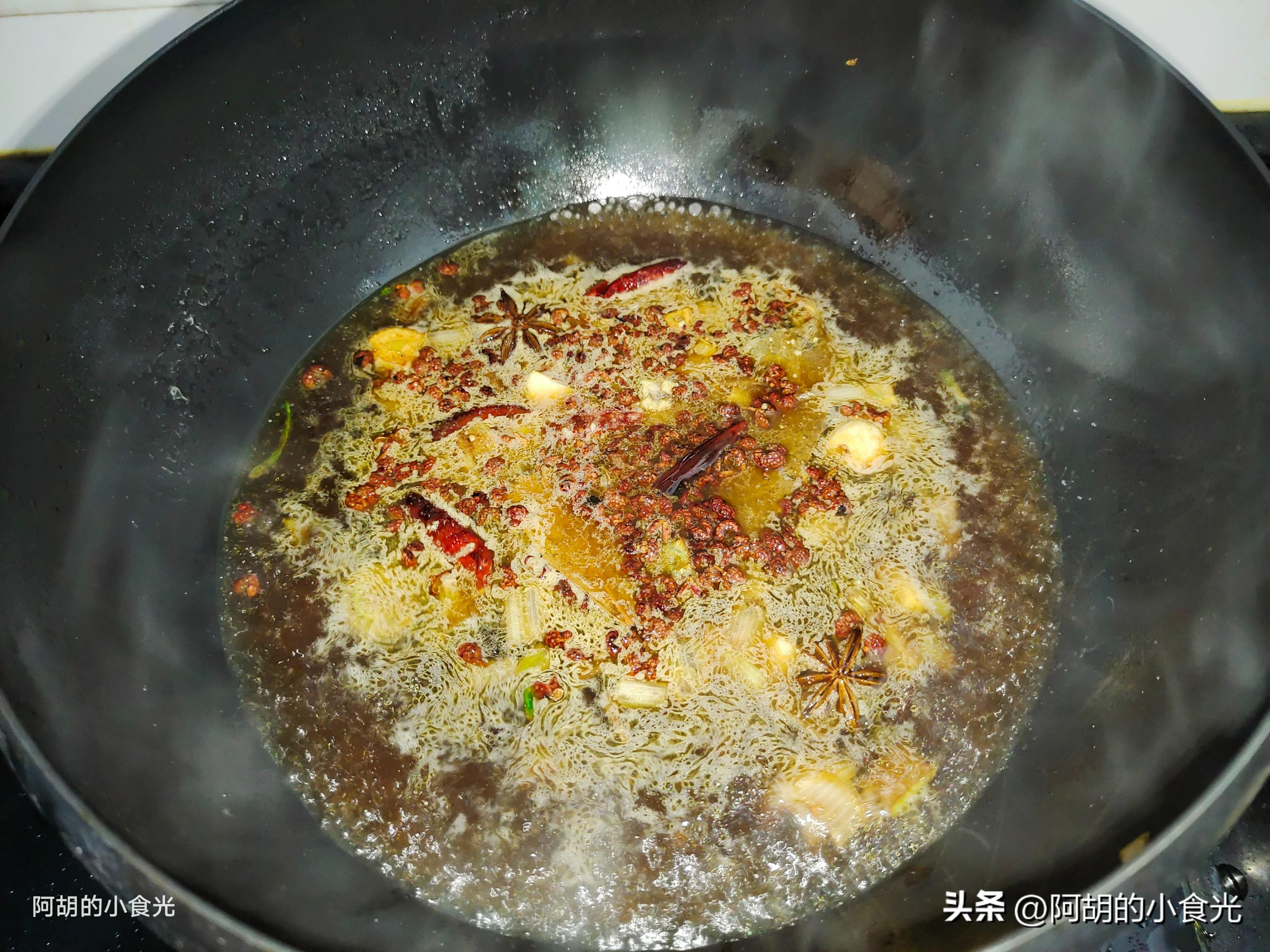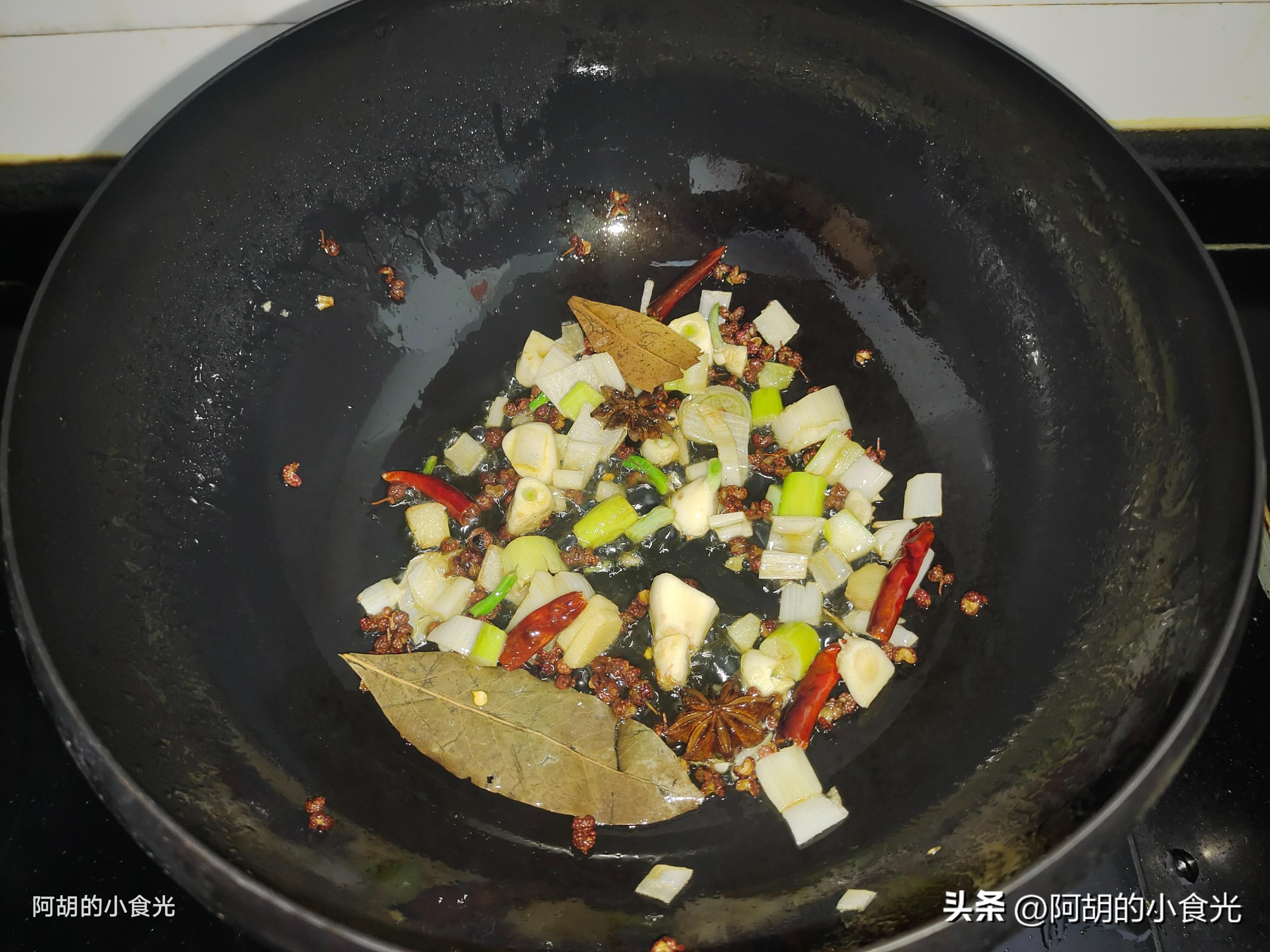 第四步:燒這個素雞還需要一個湯汁。炒鍋中添入一些菜籽油燒熱,我們下入來給你個八角,一些乾花椒和兩片香葉,還有一些蔥薑蒜和幹辣椒,一塊用小火炒出香味,再淋入一些生抽熗出香味,接着再倒入適量的開水,淋入一些老抽調調色,一些食鹽和雞精調味,就這樣大火煮個兩三分鐘,充分煮出香料的香味,關火後用笊籬把料渣全部打撈乾淨,只留下湯汁待用。