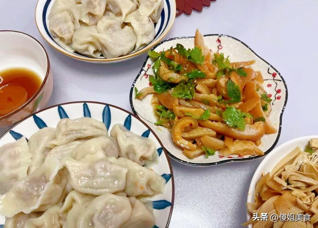 撈出來裝進大盤子,熱氣騰騰地端上桌。我還順手拌了兩個涼菜:滷豬皮切條,用蒜末、醋、一點辣椒油一拌,筋道爽口;豆腐皮切條,加香菜、生抽、幾滴香油,簡單卻開胃。一桌飯菜,有肉有菜,有主食有涼碟,不復雜,但看着就讓人心裏踏實。