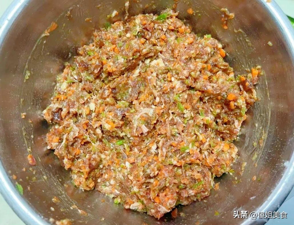 推開家門就開始忙活,麪粉加溫水,筷子攪成絮,手揉成團,蓋上半溼的佈讓它“醒”着。這邊處理餡料:牛肉剁成肉餡放進盆裏,泡好的花椒水分三次打進去,順着一個方向攪到肉餡把水“喫”得飽飽的,亮晶晶的。芹菜、胡蘿蔔切成細細的末,和蔥姜一起拌進肉裏,撒鹽、倒醬油,拌勻,餡料的香氣已經讓人忍不住咽口水。