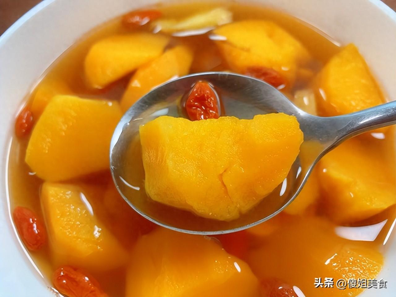 4、用筷子戳一下紅薯,能輕鬆戳透就說明熟了,這時候加入紅糖和枸杞,再煮5分鐘,等到紅糖完全融化就可以關火了。煮好的紅薯湯呈現出誘人的焦糖色,紅薯塊金燦燦的藏在湯裏,紅棗和枸杞點綴其間,看着就很有食慾。