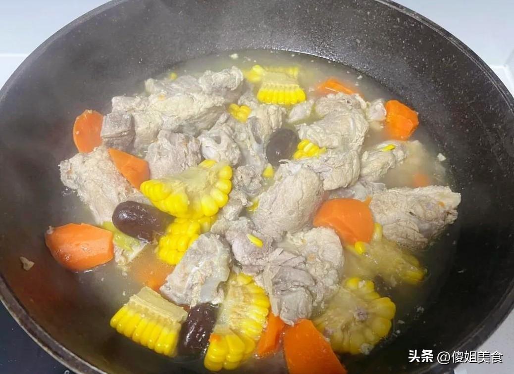 3、小火燉上40分鐘左右,這時候排骨已經熟了,但還不夠軟爛,我把胡蘿蔔切成滾刀塊,玉米切成小段,和大棗一起放進鍋裏,繼續蓋上蓋子,再燉30分鐘。