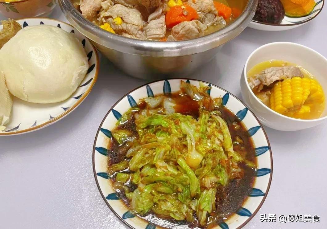 燉好的排骨,肉用筷子一撥就脫骨,但又不會爛到沒形狀,孩子最喜歡喫靠近骨頭的肉,說那裏最香。湯是清澈的,帶着淡淡的黃色,喝一口,滿嘴都是鮮甜。光有排骨太膩,得配個素菜,手撕包菜是我家的常備菜,幾分鐘就好,又脆又下飯。