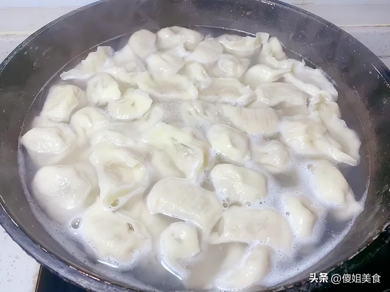 煮餃子要水寬火旺,下鍋後用勺子背輕輕推幾下防止粘底,水開後再點兩次涼水,看到餃子全都鼓着白肚皮浮上來,就是熟了。