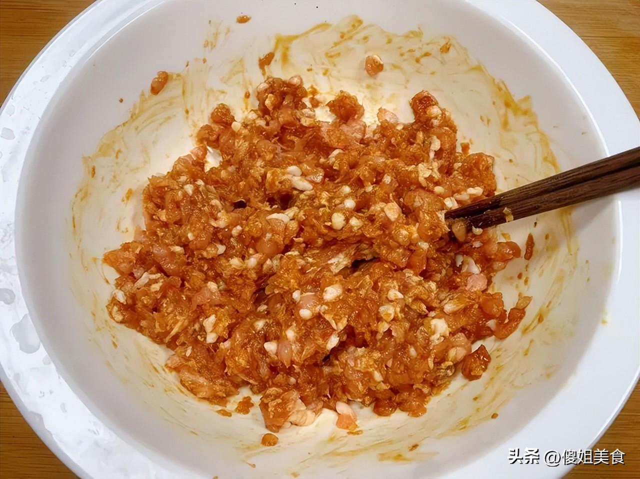 2、豬肉餡選帶點肥的最好,太瘦了口感會柴,老媽調餡有絕招:先在肉餡里加入適量生抽、少許老抽上色,再來點料酒去腥,然後順着一個方向攪拌,邊攪邊分次加入少量清水,這樣調出來的肉餡特別嫩。