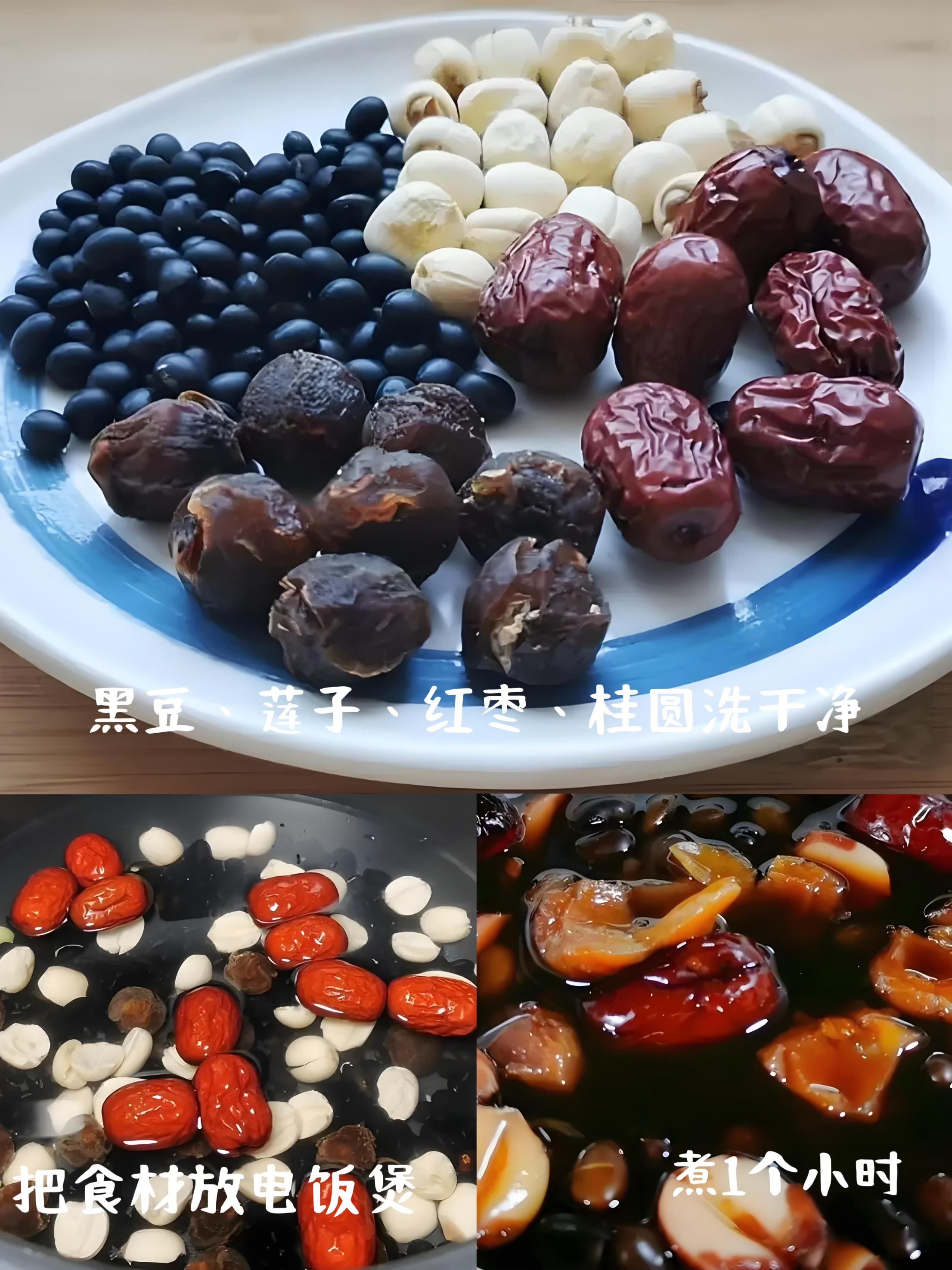 1. 蓮子和黑豆提前用清水浸泡2-3小時,泡到微微發脹。紅棗洗淨去核,桂圓乾稍微沖洗一下。