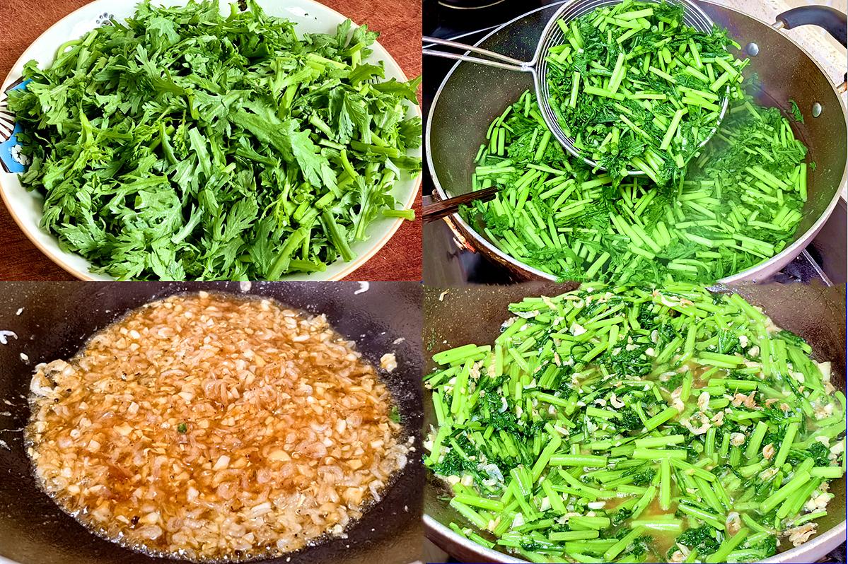 3. 鍋裏再添點油,放入一半的蒜蓉爆香。先放入茼蒿梗部分,轉大火快速翻炒約1分鐘。放入茼蒿葉和炒過的蝦皮,繼續大火快炒。