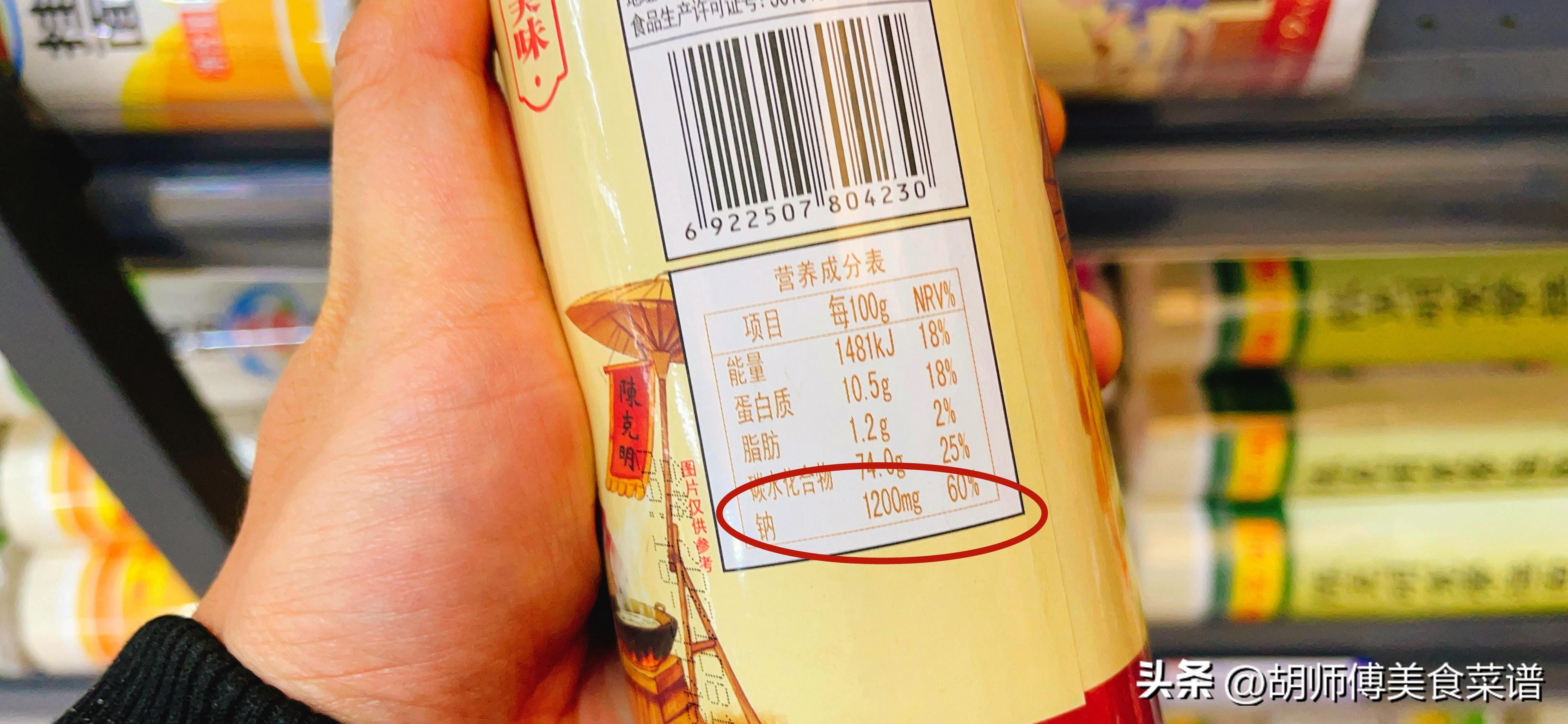 買掛麪時,我喜歡看一下掛麪的鈉含量,因爲鈉就代表掛麪中鹽含量,如果掛麪中的鈉含量很高,我不建議大家購買。世界衛生組織(WHO)建議成年人每日鈉攝入量應低於2000毫克(5克食鹽),有的掛麪,100克就含有1000毫克以上的鹽,喫上一碗麪,一天的食鹽就會超標,長期喫高納掛麪,不僅易得高血壓,而且還容易誘發各種疾病,建議建議買鈉低於500毫克的掛麪,喫着會更健康。