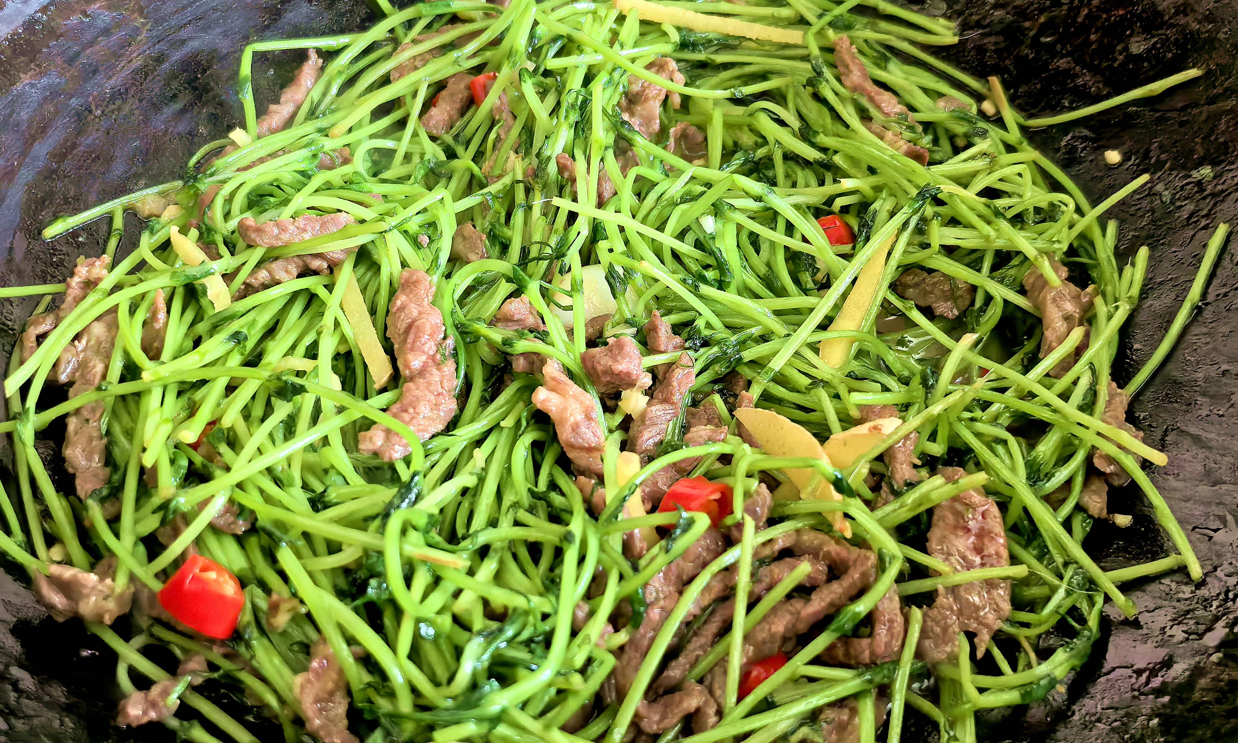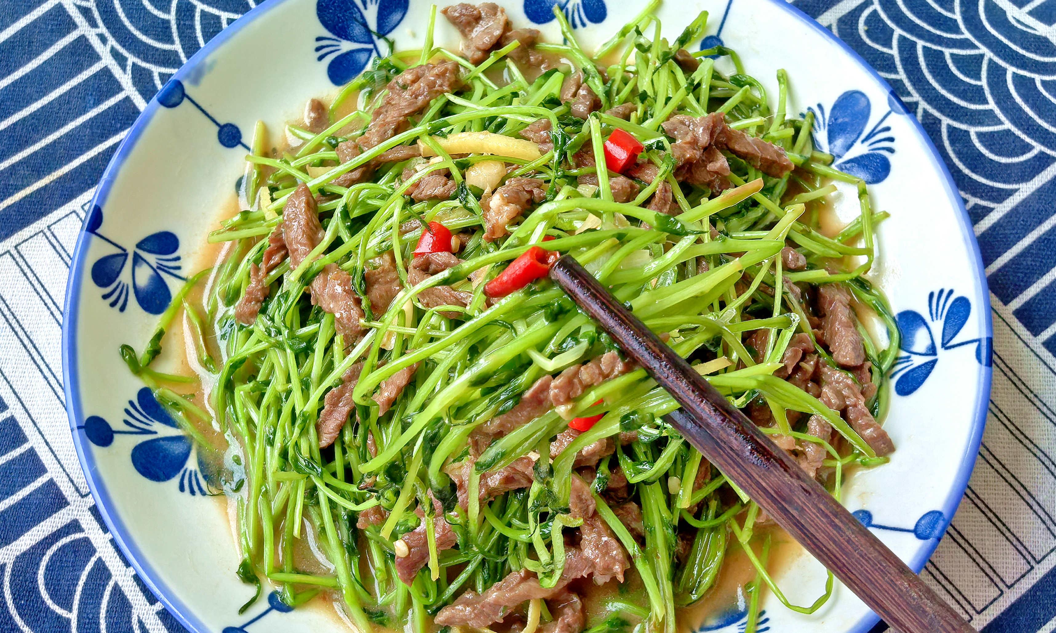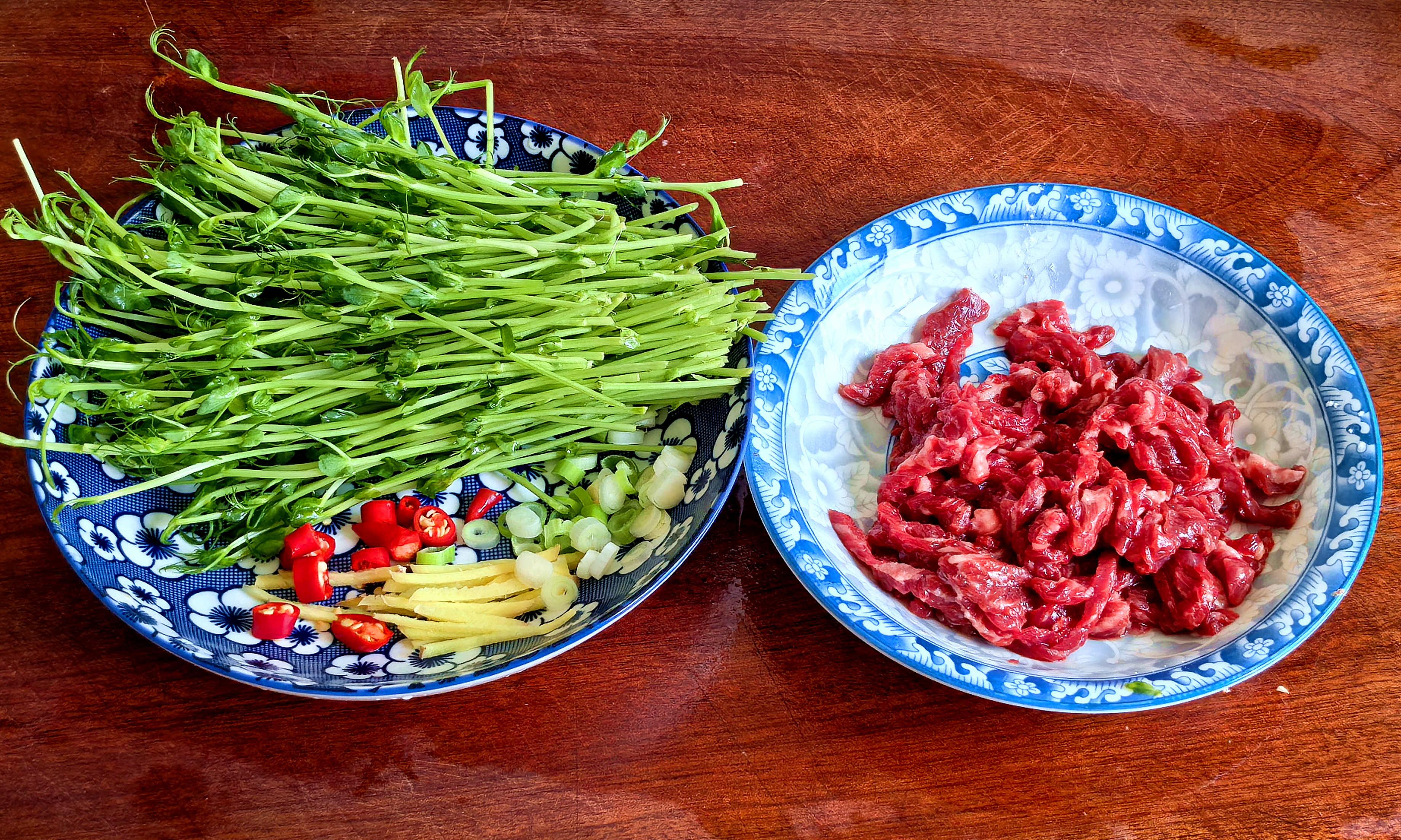 準備材料:新鮮豌豆苗 1大把(約300克),牛裏脊肉 150克,大蒜 4-5瓣,小米辣 2-3根(根據喫辣程度調整),生薑 1小塊,生抽 2勺,料酒 1勺,澱粉 1勺,蠔油 1勺,鹽 適量,白糖 少許(提鮮用)食用油 適量