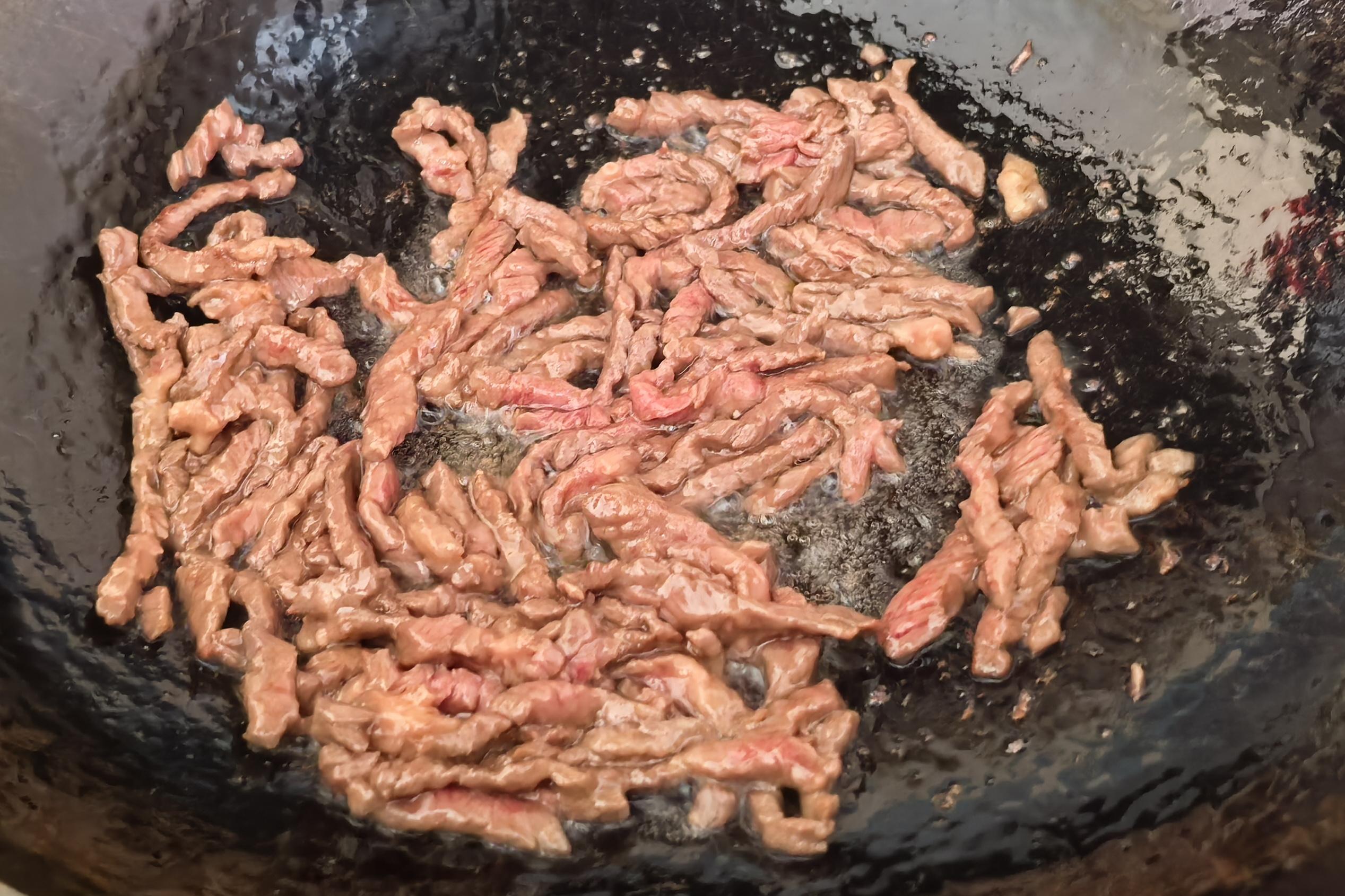 1. 鍋裏倒比平時炒菜稍多一點的油,燒到六成熱(油麪略有波紋),把醃好的牛肉絲倒進去。