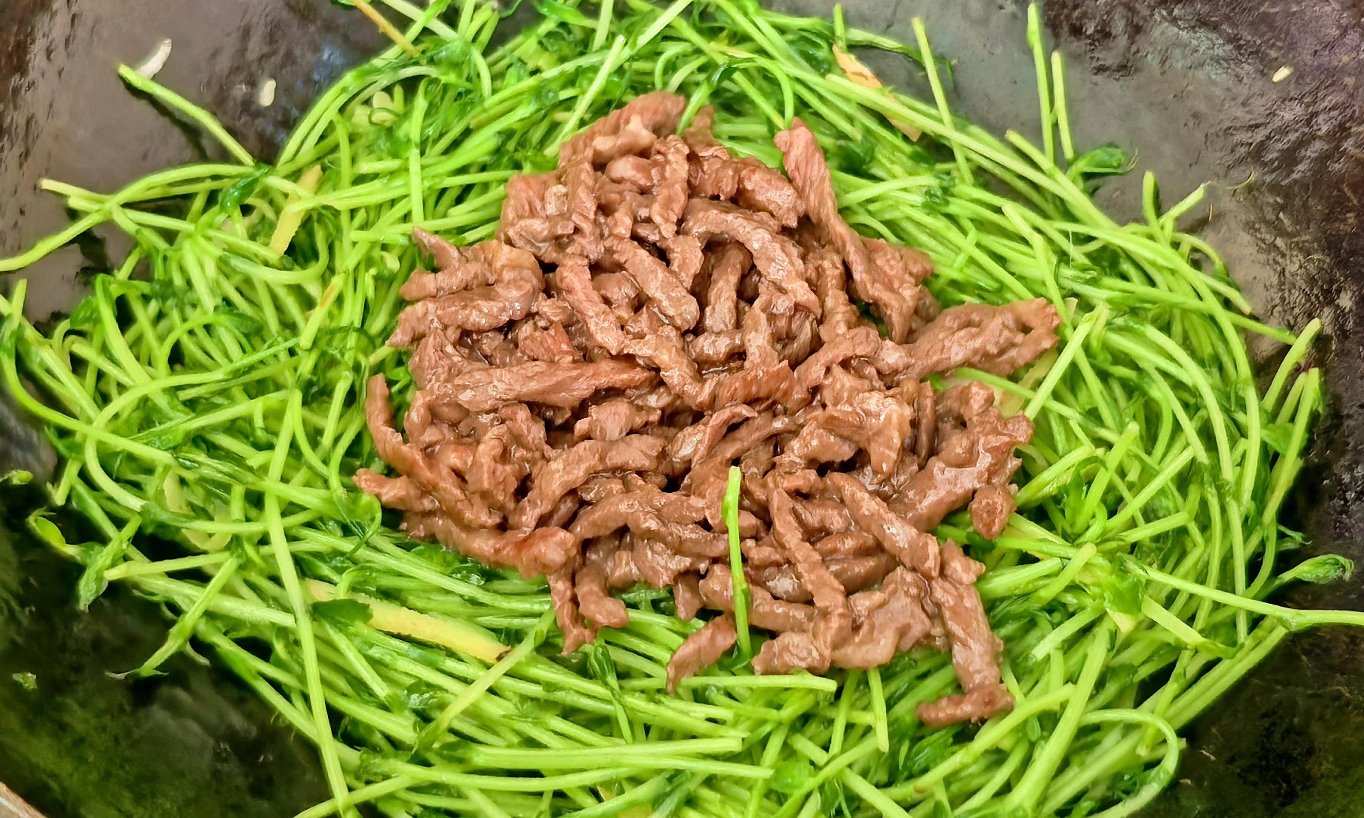 2. 看到豌豆苗稍微塌下去時,把之前炒好的牛肉絲倒回鍋裏。