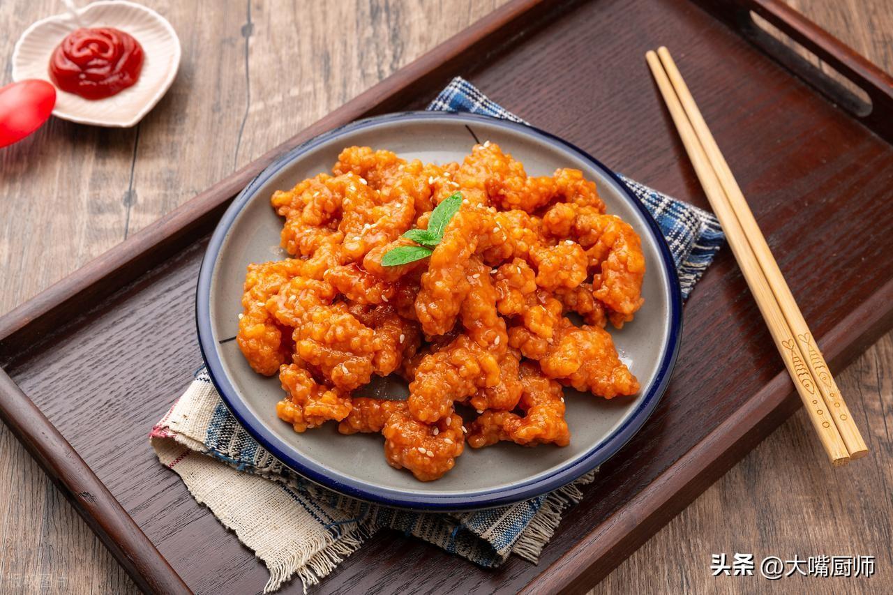 炸制:油溫六成熱時下肉條,炸至金黃撈出;復炸一次更酥脆。