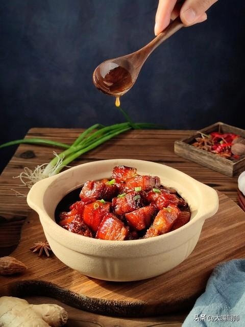 燉煮:加生抽、老抽、八角、桂皮、香葉,加水沒過肉塊,小火慢燉1小時。