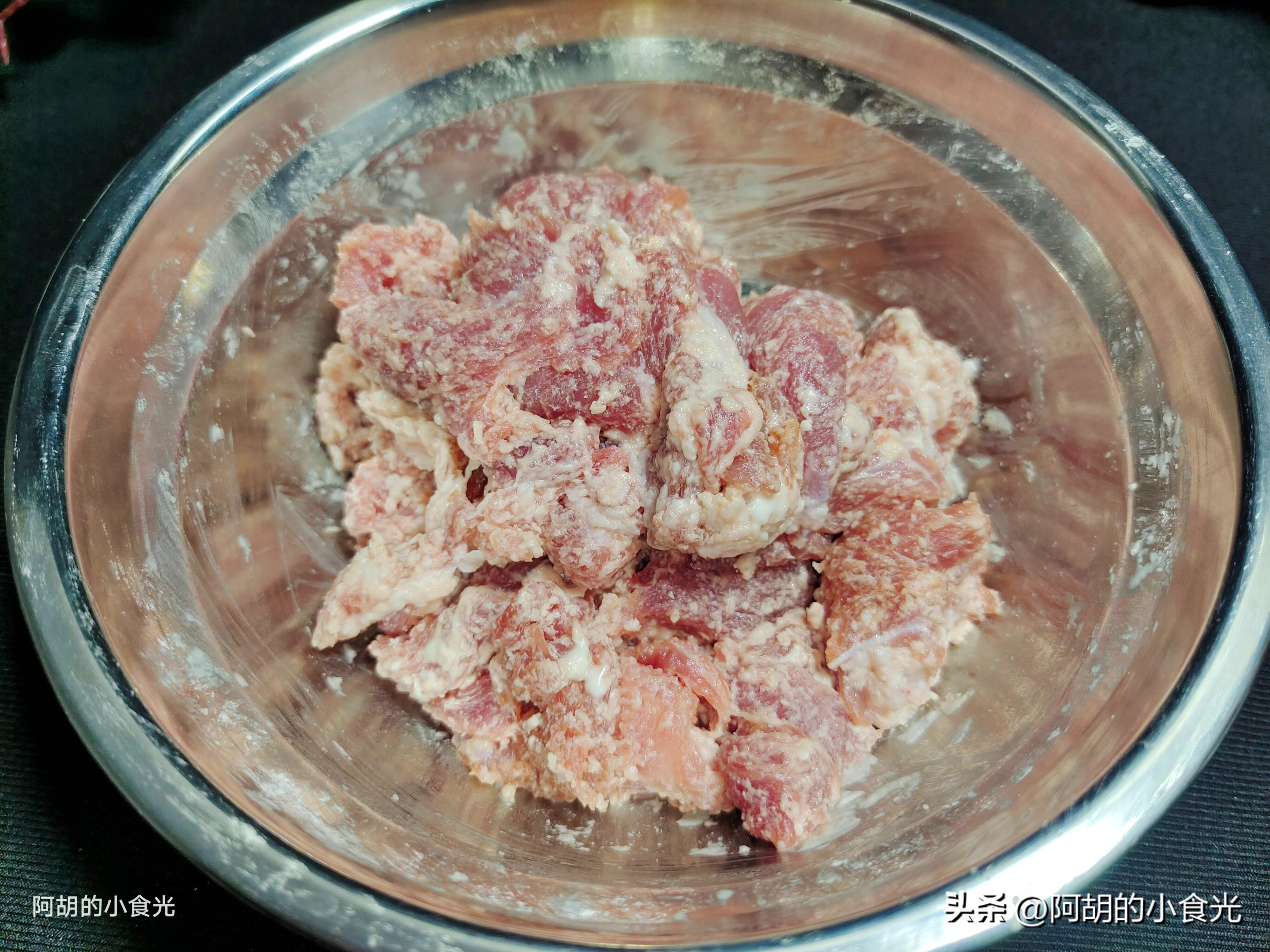 第一步:我們先來把這道湯裏的滑肉準備好。主要的原料就用梅頭肉的瘦肉部分,沖洗乾淨後切成片放入碗中,先撒入少許的食鹽、雞精和生抽充分地抓拌均勻。而後少量多次地加入紅薯澱粉,充分地抓一抓,讓肉片都裹滿澱粉即可。若比較幹則可以少淋入一些清水再抓勻。