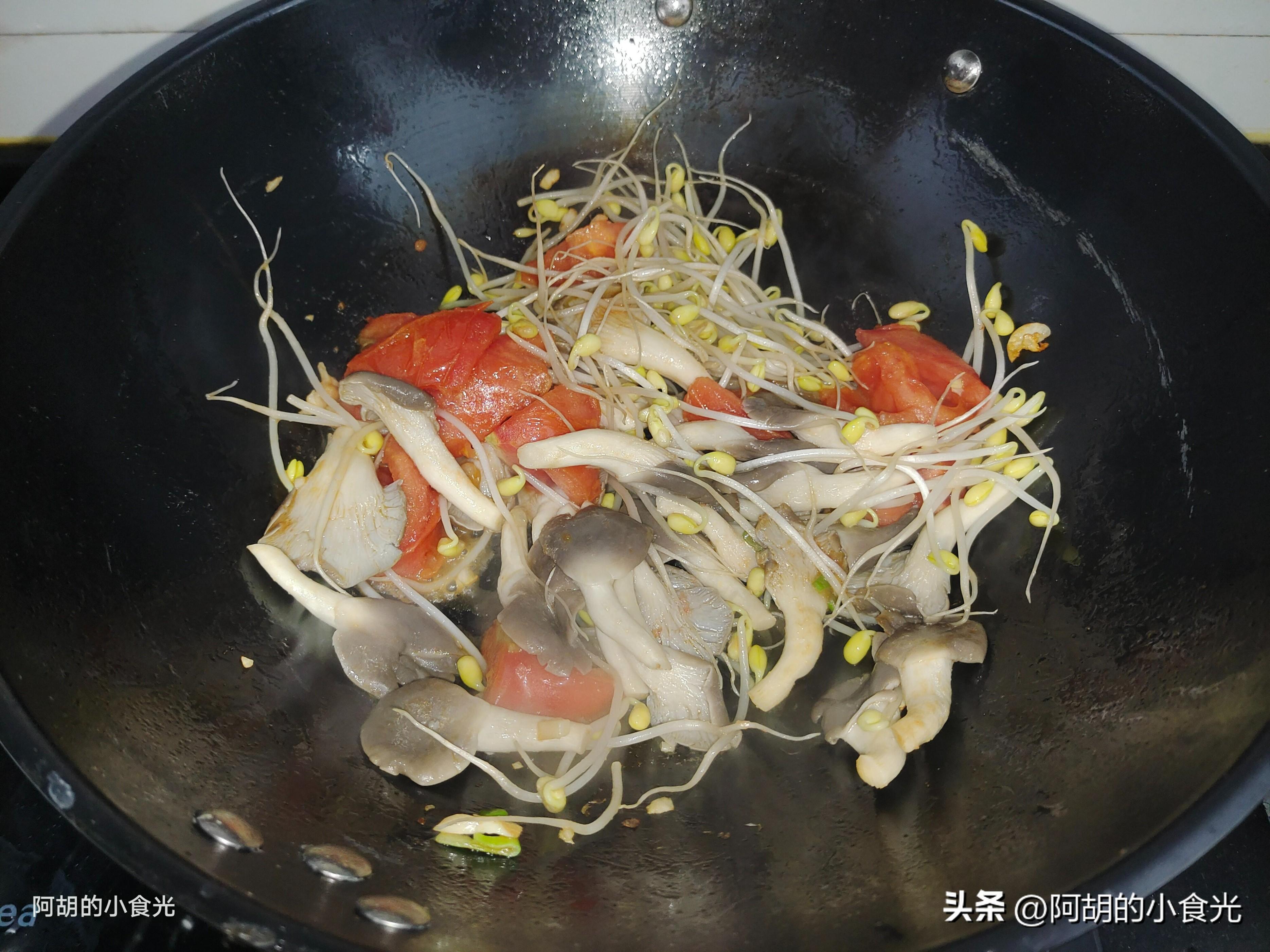 第四步:煮湯的其它食材也很簡單,西紅柿一個切塊,黃豆芽一小把洗乾淨,再來平菇適量洗淨焯水後待用。鍋燒熱後就淋入一些花生油燒熱,而後下入蔥薑蒜末適量炒出香味,再把西紅柿塊、黃豆芽和平菇一塊丟入鍋中,轉爲大火快速炒一炒,炒出食材的香味。