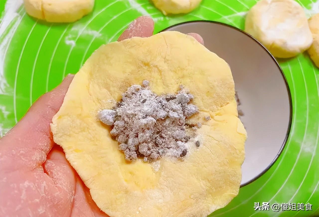 麪糰醒好了,揪成小劑子,擀成餅皮,舀一勺紅糖餡兒放進去,像包包子一樣收口,再輕輕按成小餅。