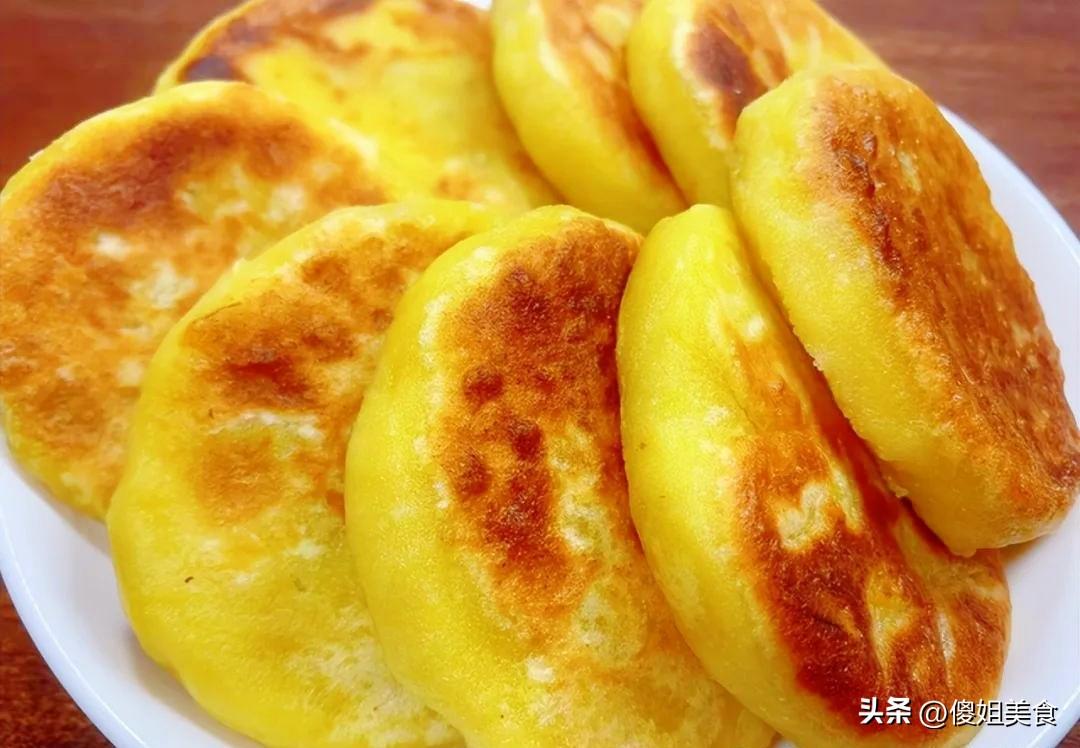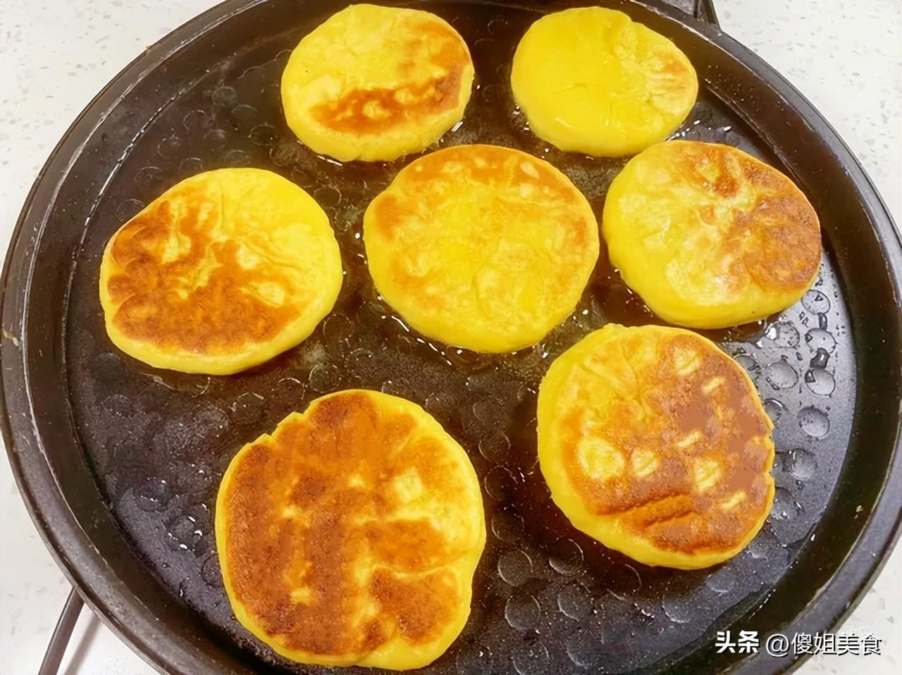 4、平底鍋燒熱,倒一點點油,把餅放進去,小火慢慢煎,煎到兩面金黃,餅身微微鼓起,就可以出鍋了。這時候要忍住,別急着咬,燙。