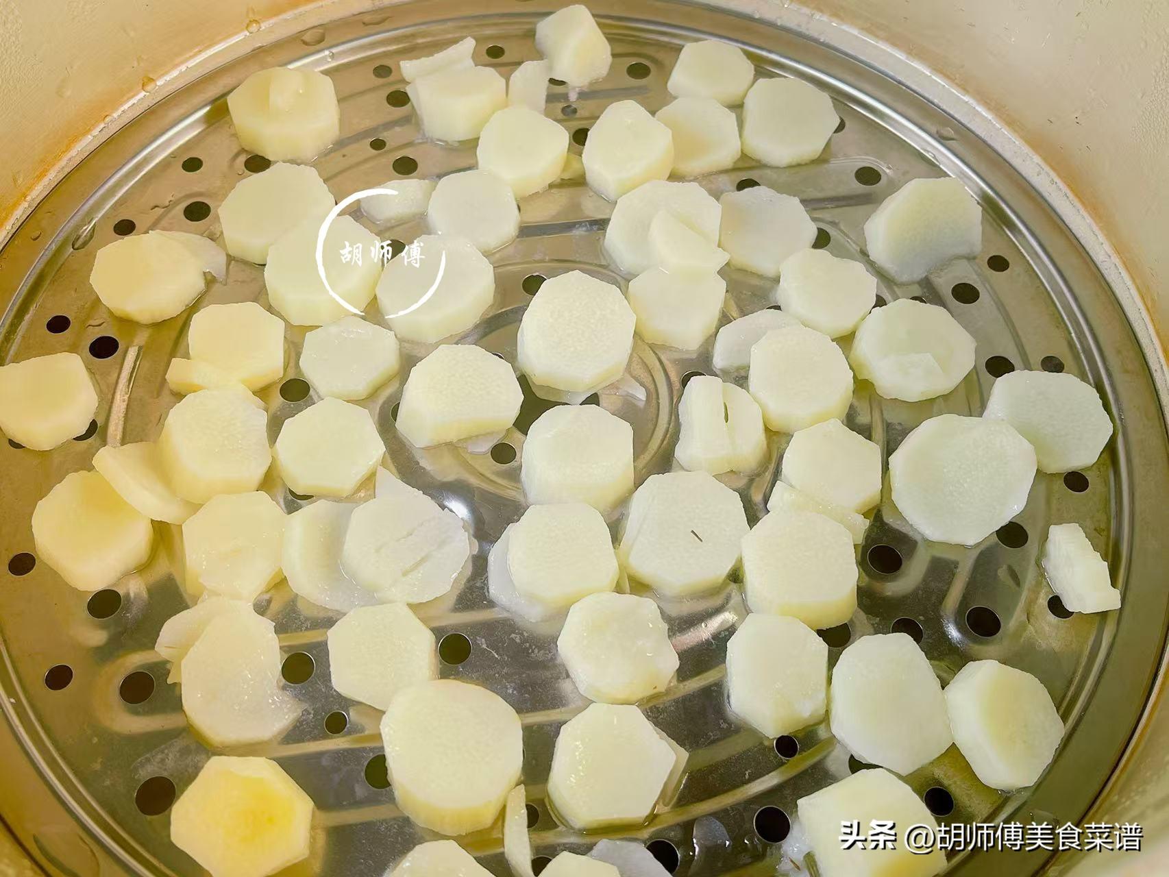 第二步:將切好的山藥放入蒸鍋中,大火將山藥蒸15分鐘左右,直到用勺子能輕鬆的將山藥按壓成泥,就代表山藥蒸好了,此時立即關火,把山藥放入盆中。