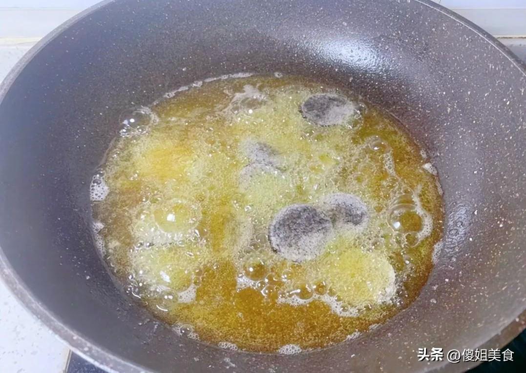第二步:鍋裏倒油,油量要能沒過腸片,開中火加熱,油溫很重要,太低了腸片會吸油,太高了外面焦了裏面還沒熱。測試油溫的小竅門:扔一小塊裹了粉的邊角料進去,如果它周圍立刻冒出密集的小泡泡,並且很快浮起來,油溫就合適了。