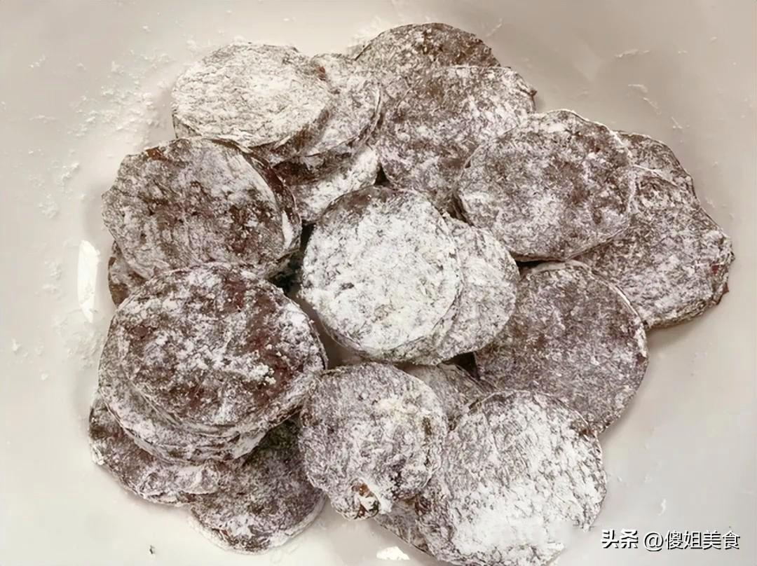 拿一個大碗,倒進玉米澱粉。把腸片一片片放進去,輕輕晃動碗,讓每一片都均勻地裹上薄薄一層粉。別用手抓,容易把腸片抓碎。裹好粉後稍微靜置兩分鐘,讓澱粉回潮,這樣炸的時候不容易掉粉。