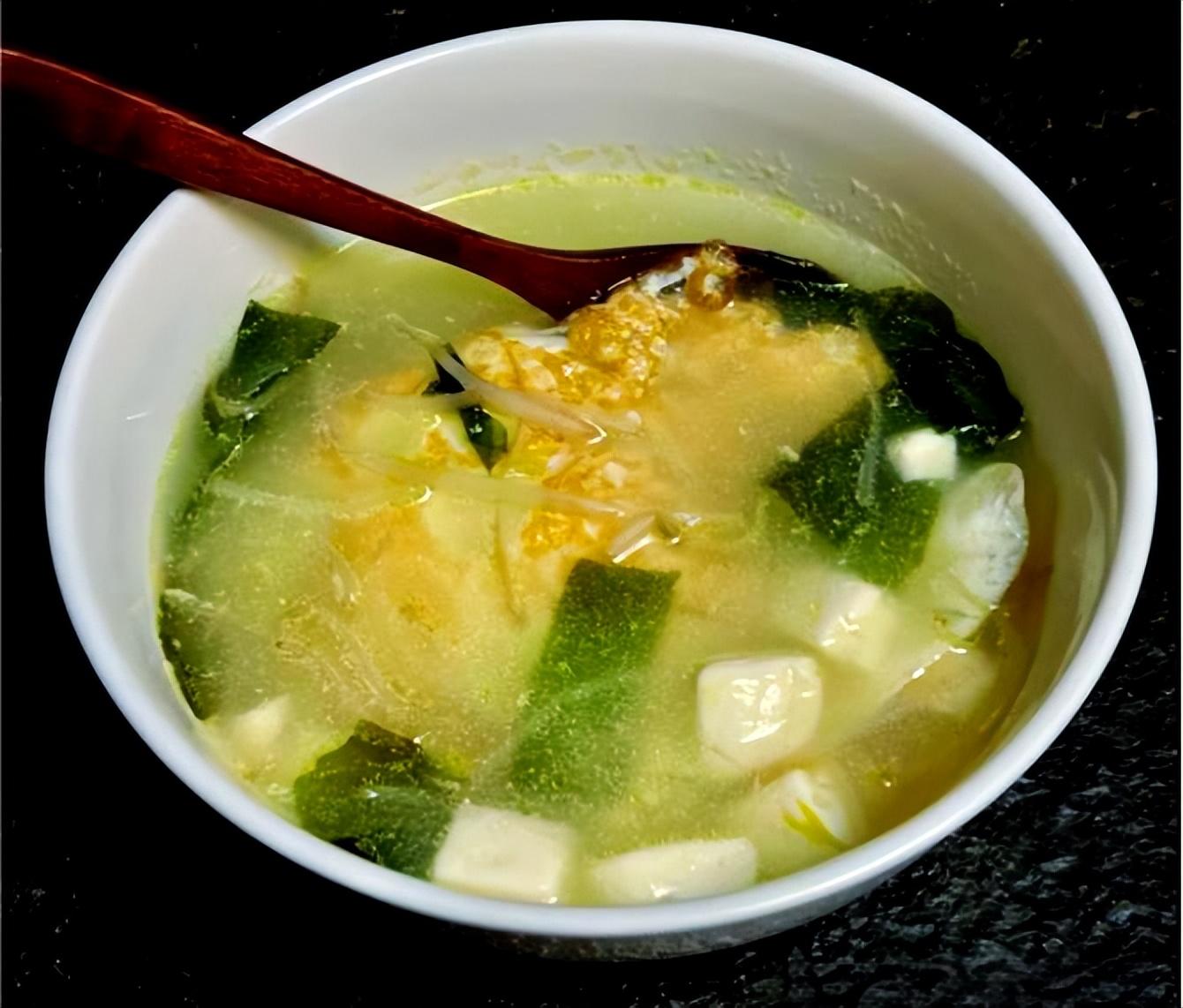 食材:豆腐1塊,海帶,雞蛋2個,鹽,胡椒粉,蔥, 香油