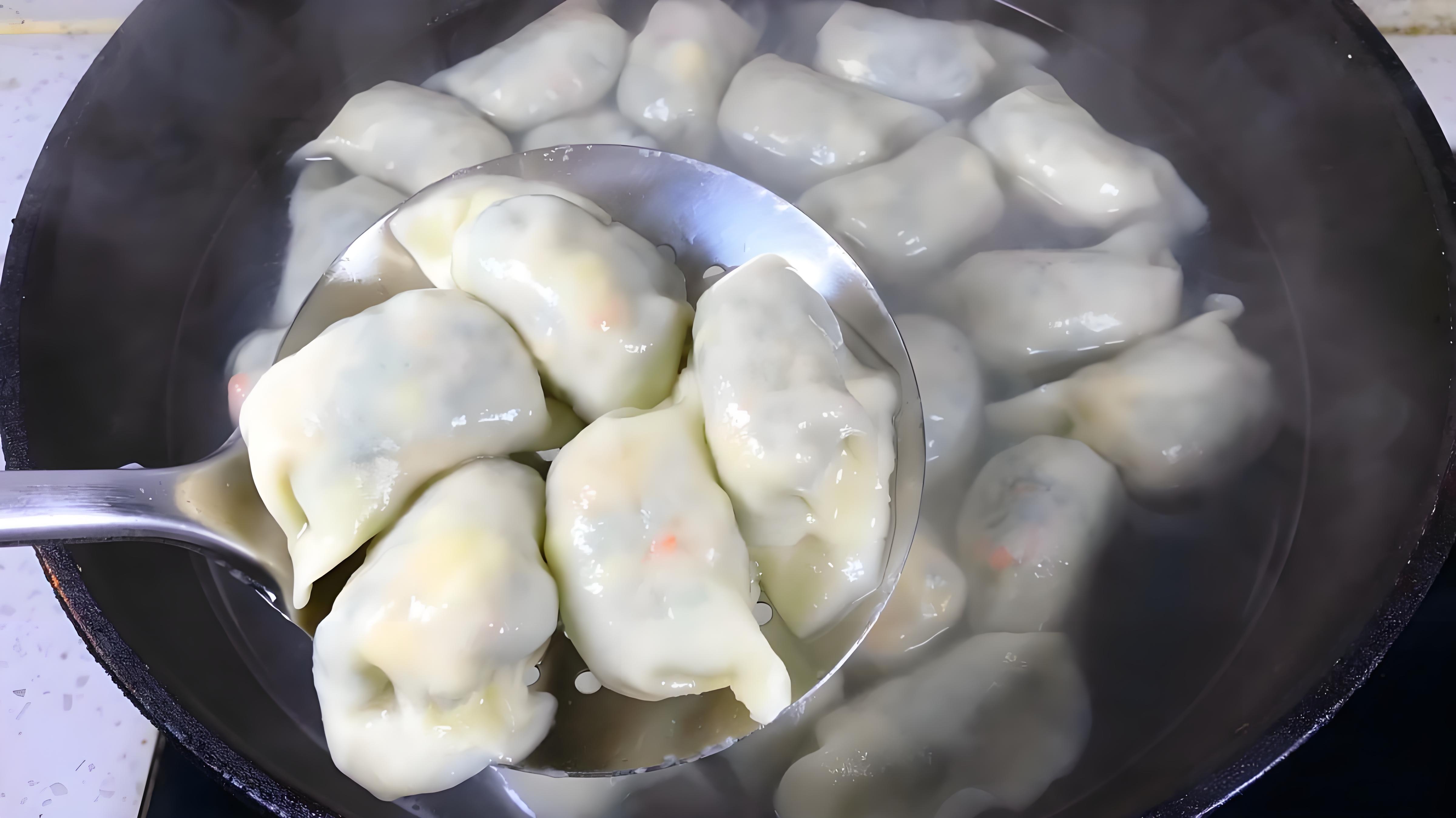 3. 水開後點入半碗涼水,重複三次(即“三點水”),餃子全部浮起、肚皮鼓鼓的就熟了。用漏勺撈出,裝盤上桌!