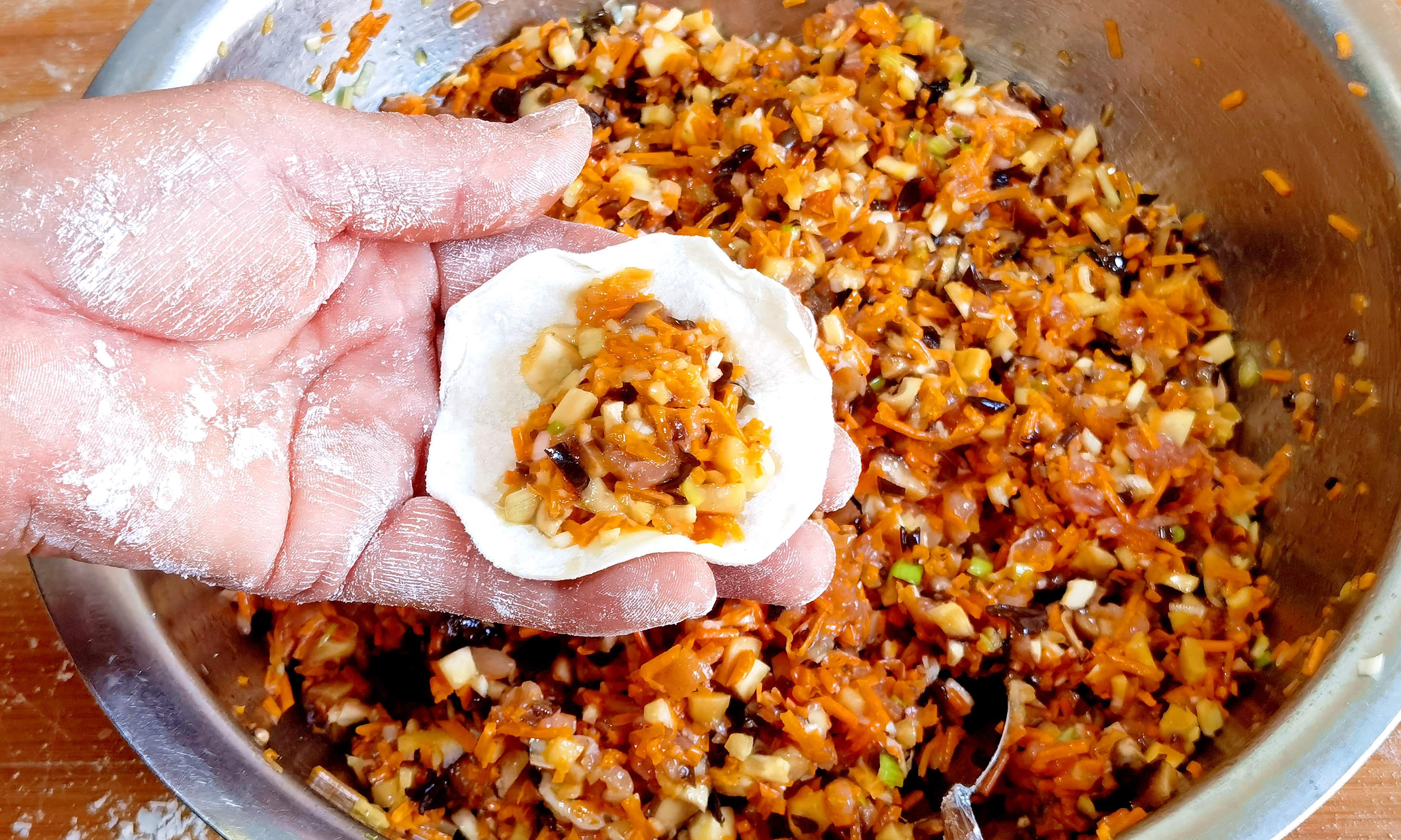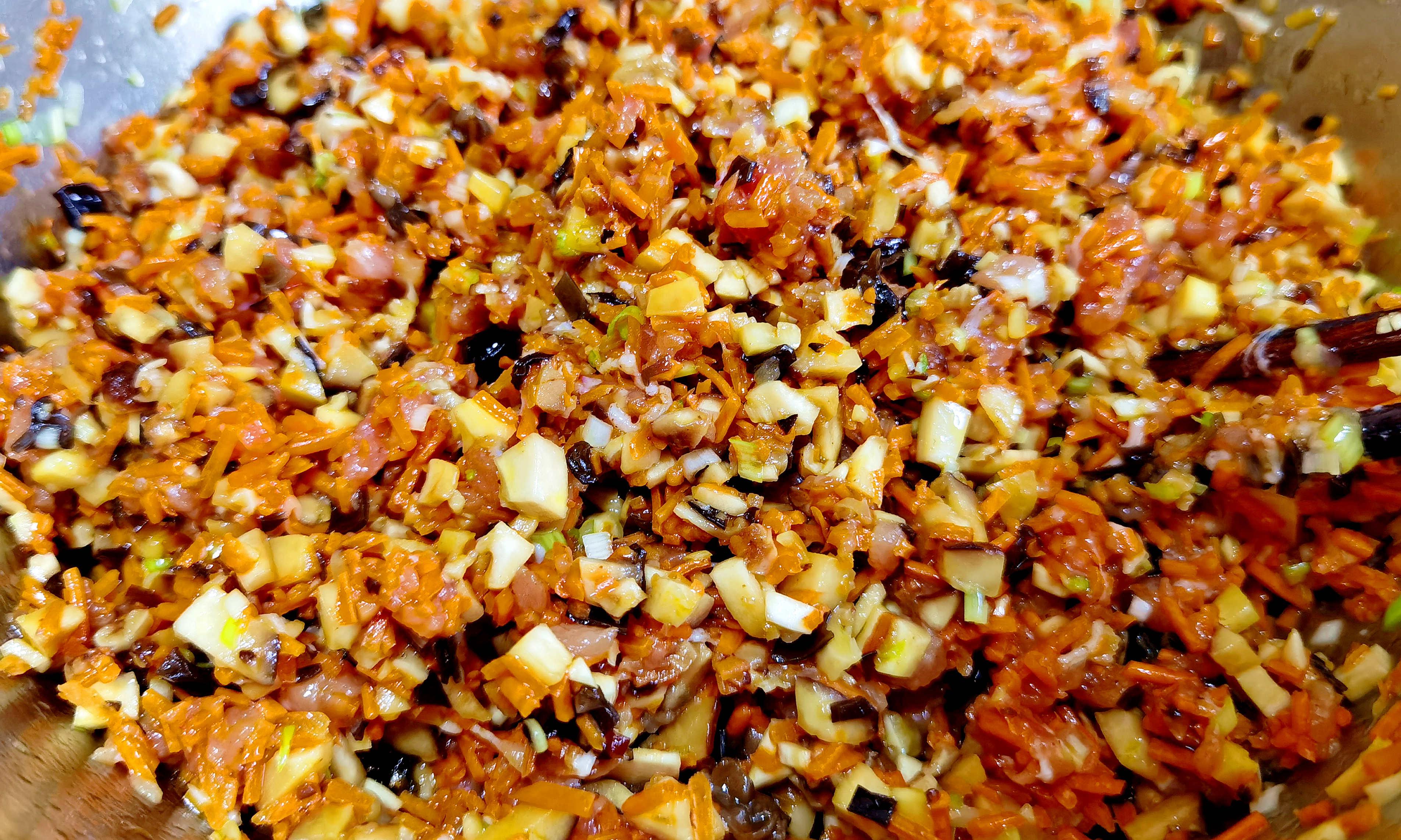 1. 胡蘿蔔可以先用少許鹽醃一下,擠掉多餘水分再拌餡。香菇如果水分大,也可以稍微炒一下去除水分。