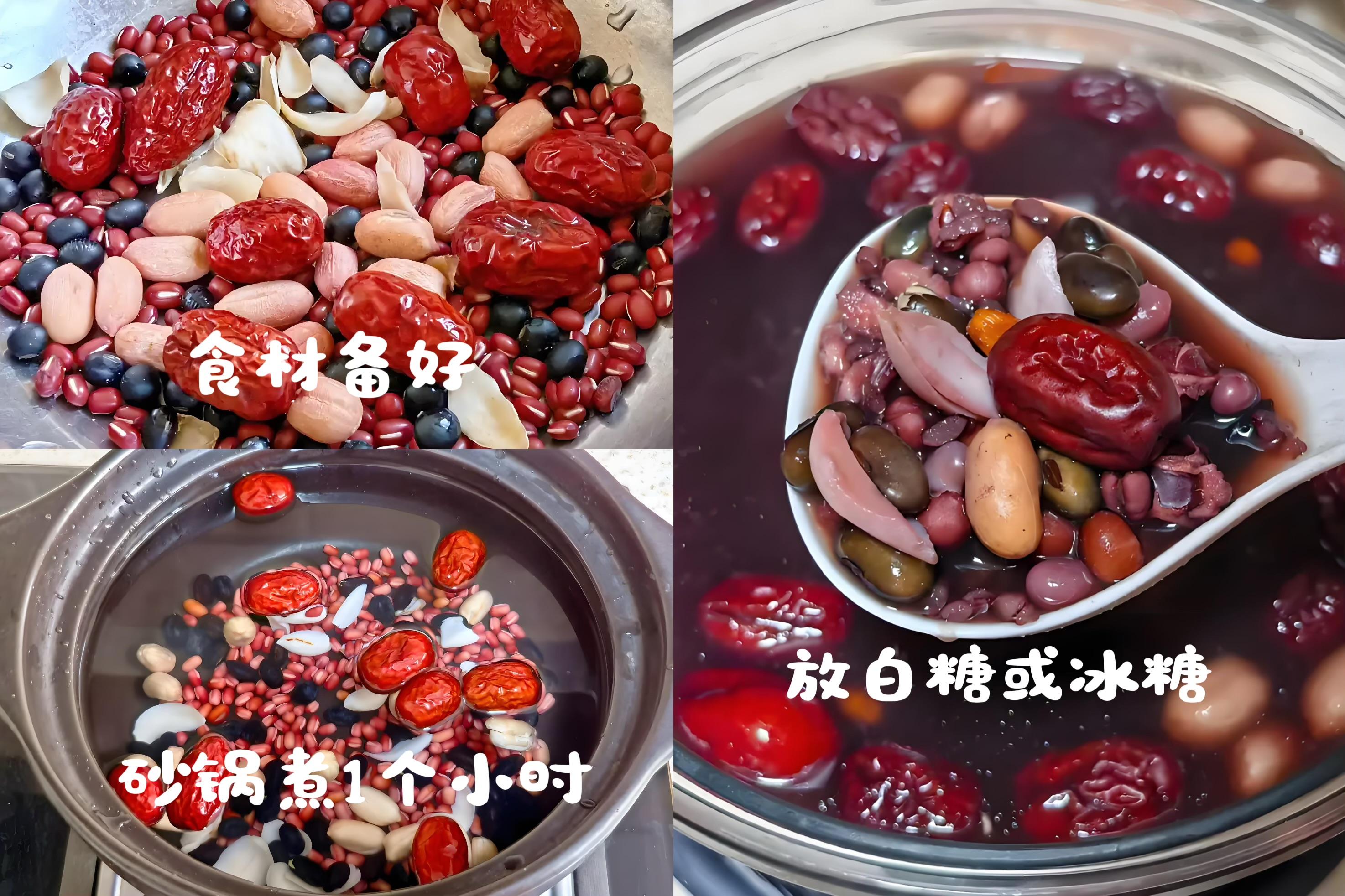 3. 熬煮:大火燒開後轉小火,慢慢熬煮1-1.5小時,直到所有豆子都變得軟糯開花,湯色變得深紅濃稠。