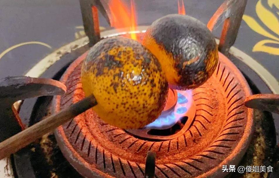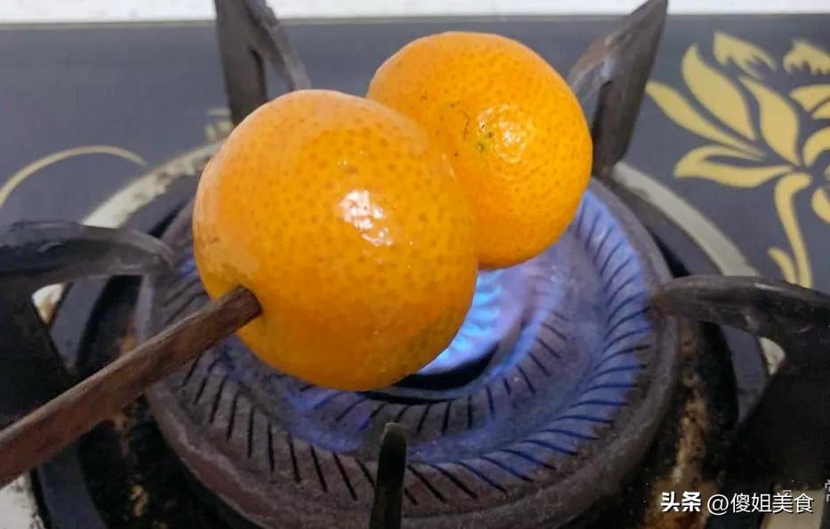 我試着串了兩個,打開小火,把橘子懸在火苗上方慢慢轉動。橘皮在火焰的烘烤下,顏色漸漸加深,從鮮橙色變成深橙色,再慢慢泛起黑色斑點。一股焦糖混合着橘皮清香的獨特氣味飄散開來,怪好聞的。