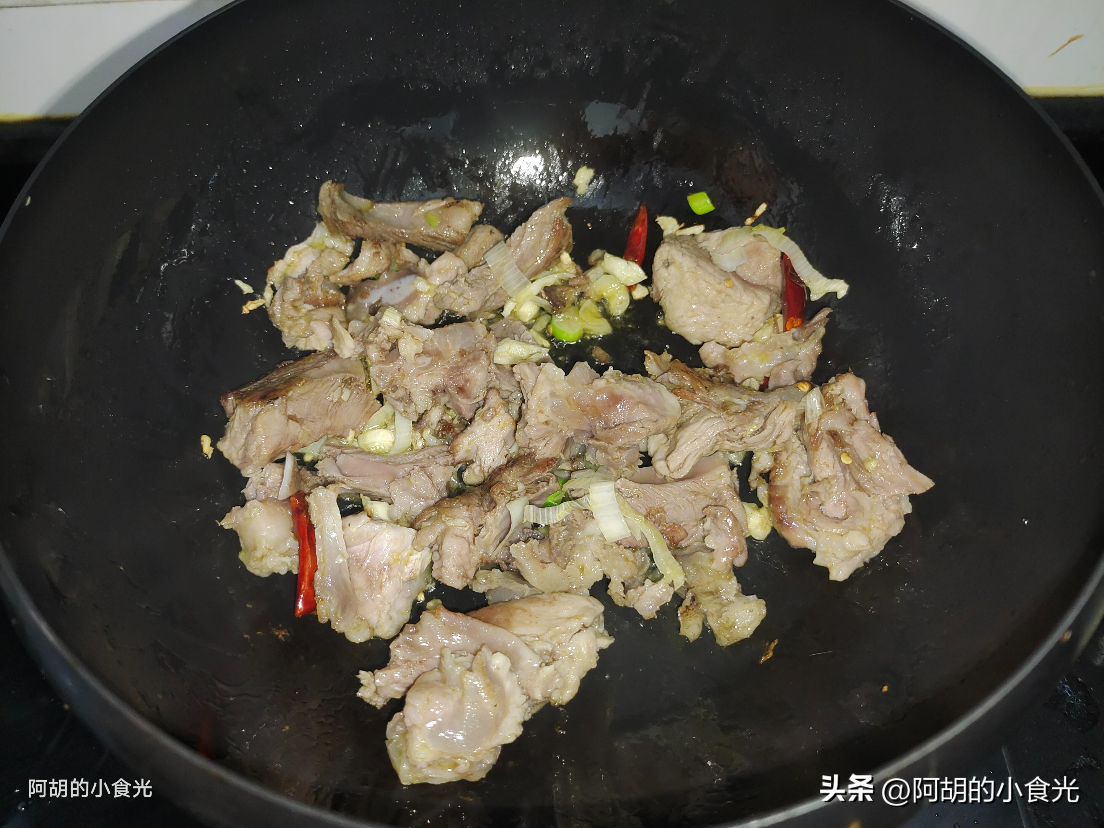 第三步:所有食材都備好和預處理好後就可以開火烹飪。先把鍋烘乾,淋入一些菜籽油小火燒熱,而後把拆骨肉直接倒入鍋中炒一炒,再將蔥薑蒜和幹辣椒也倒入鍋中,轉爲大火炒出香味。