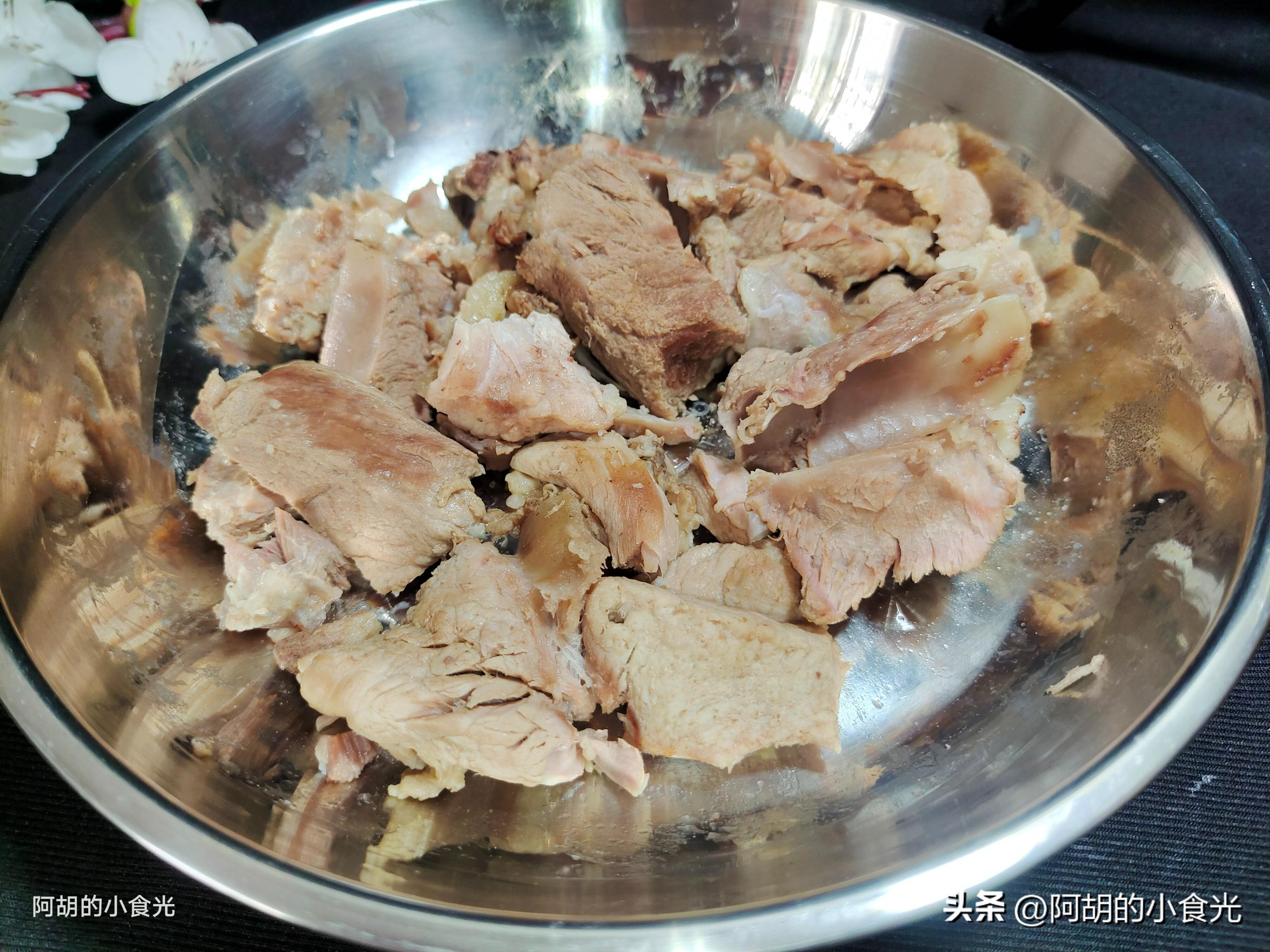 第一步:拆骨肉很簡單,就是筒子骨或者扇子骨燉煮熟透後把肉拆下來即可。不過今天這個筒子骨在燉的時候最好加入一些香料,蔥姜、八角兩個,一片香葉和一小把乾花椒即可,燉煮40分鐘左右就撈出,冷卻後再將肉拆下即可。而剩下的湯汁把香料打撈乾淨後留着備用。