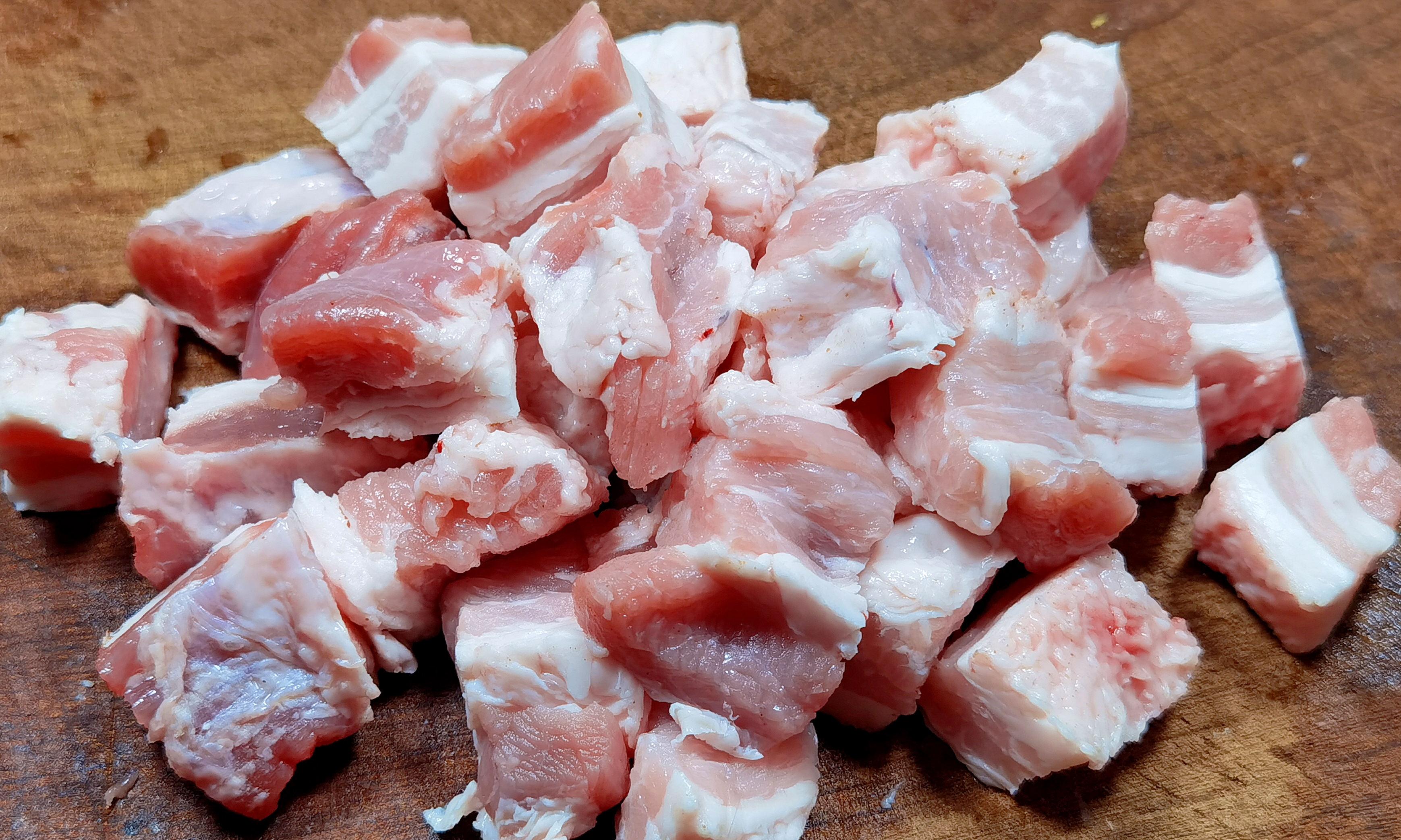 2.五花肉洗淨,切成麻將塊大小。切完之後,有個關鍵步驟:冷水下鍋焯水。肉塊和涼水一起入鍋,加1湯匙料酒和幾片姜,開大火煮。水開後,浮沫會慢慢出來,用勺子耐心撇乾淨。焯個兩三分鐘,肉色變了就撈出來,用溫水沖洗掉表面的浮沫,瀝乾。這樣處理過的肉,燉出來不腥,湯也清亮。