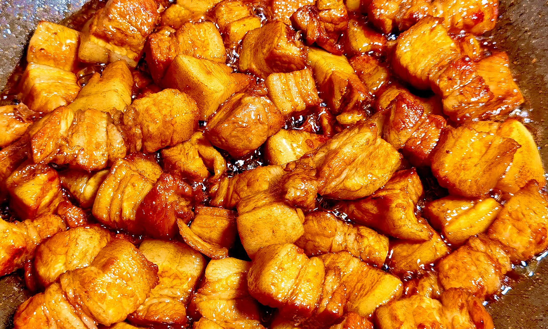 3.鍋燒熱,倒一點點底油,轉小火,把冰糖放進去。咱們不着急,用鏟子慢慢攪和,看着冰糖從大塊變小塊,慢慢融化,變成琥珀色的糖漿,並且開始冒起細密的小黃泡。把焯好瀝乾的五花肉塊,迅速倒進糖色裏,快速翻炒,讓每一塊肉都均勻地裹上糖色。接着,放入薑片、蔥段和八角,一起煸炒出香味。沿着鍋邊淋入1湯匙料酒,香氣“滋啦”一下就躥上來了。