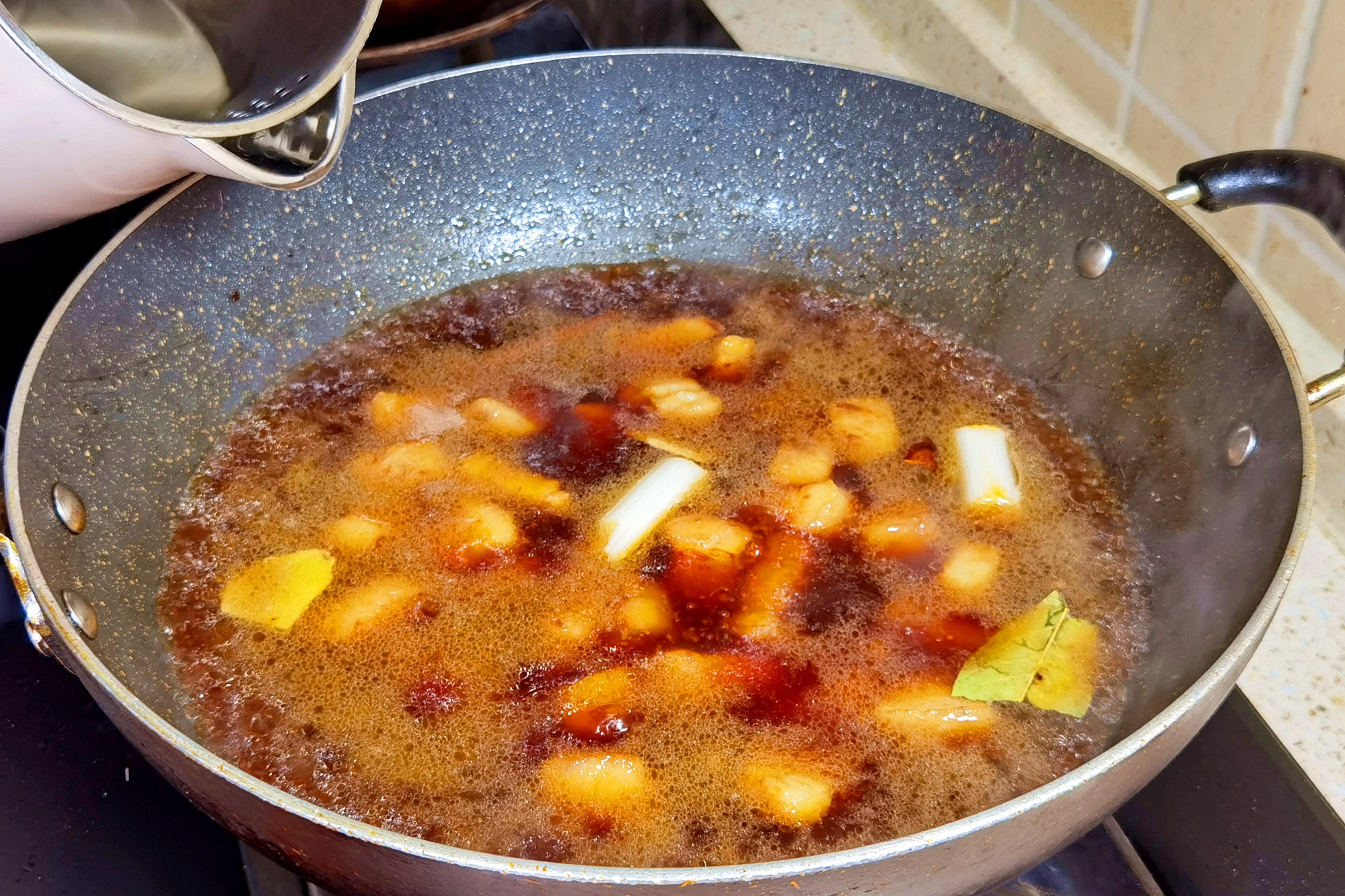 4.倒入生抽和老抽,翻炒均勻,讓醬油的醬香和糖色的焦香融合。然後,一定要加入足量的開水!水量要一次加夠,能沒過所有肉塊還要多一些。記住,燉肉中途儘量別再添冷水,否則肉容易緊縮,口感變柴。蓋上鍋蓋,先大火燒開,然後轉成小火,慢悠悠地燉上40分鐘。