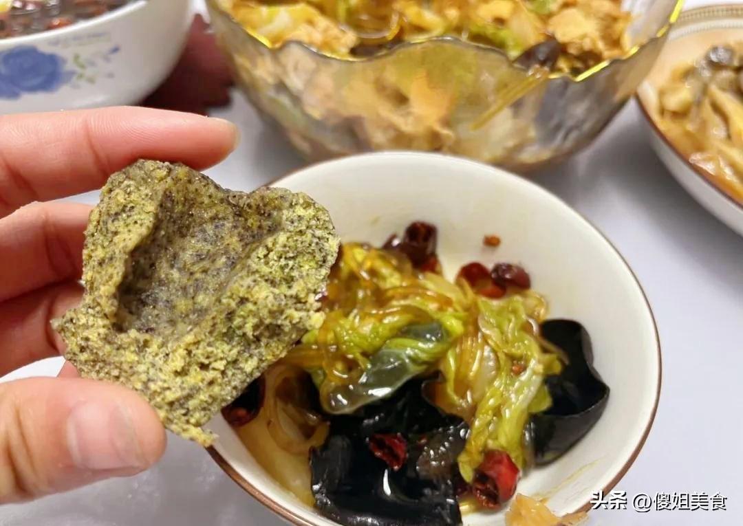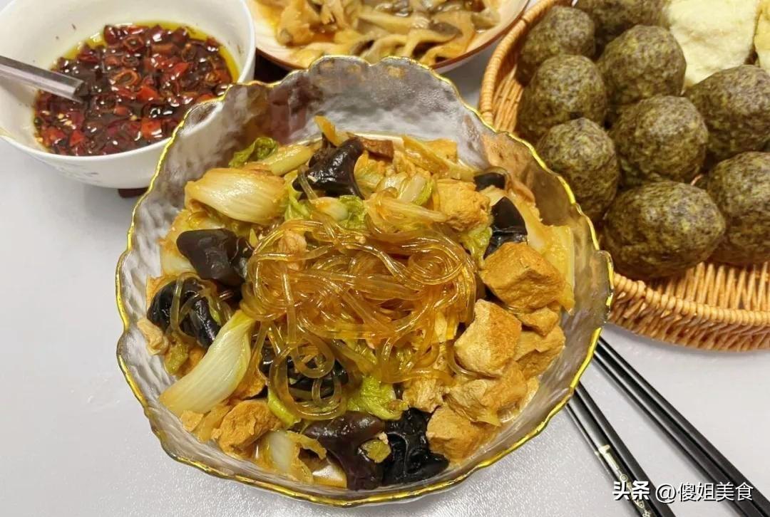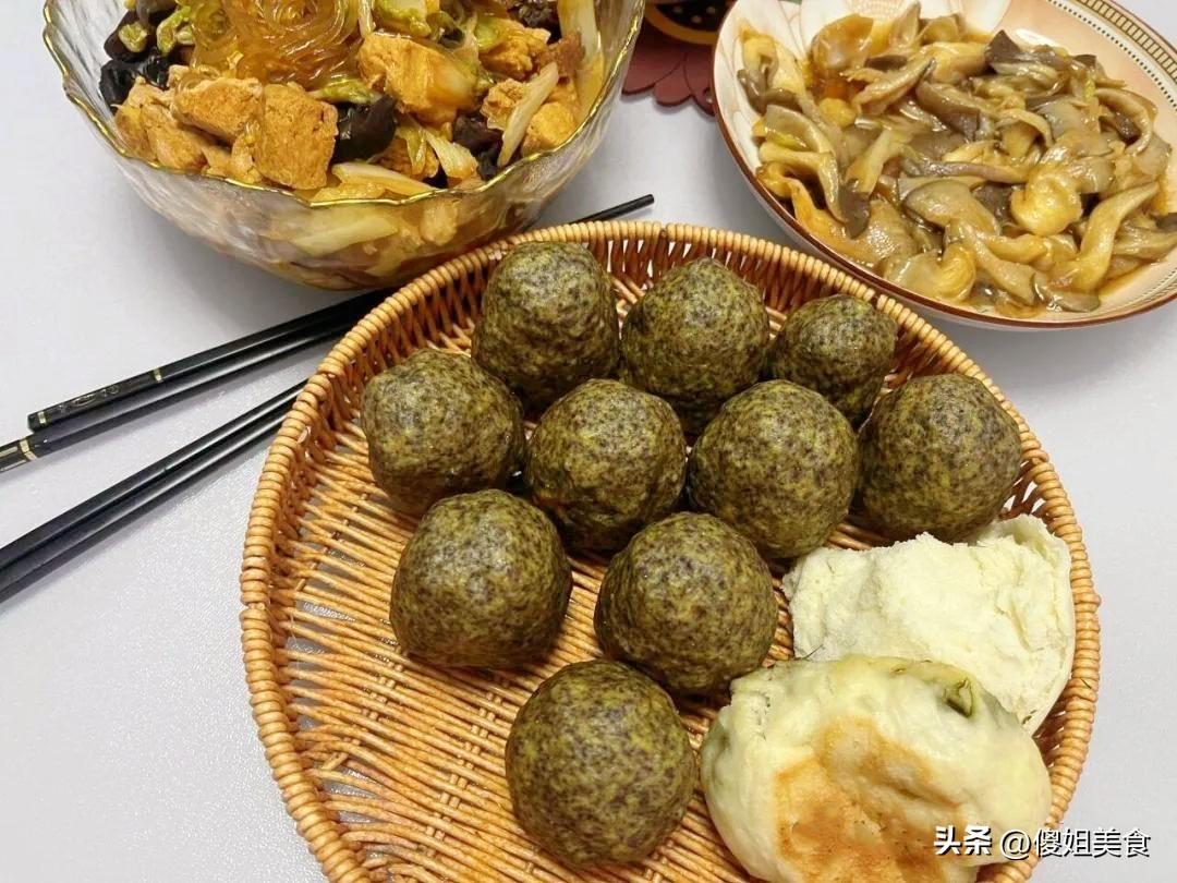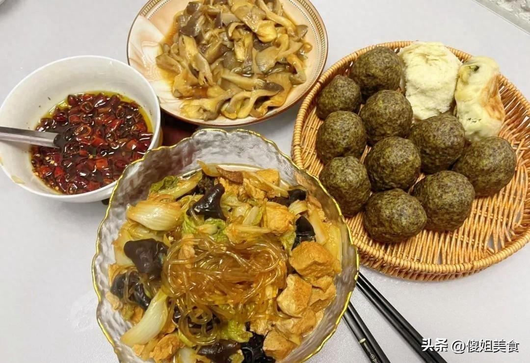 點開一看,嚯,這擺盤、這色澤!一個是大白菜豆腐燉粉條,另一盤是清炒平菇,簡簡單單卻透着鮮氣。主食更絕,是頭天晚上我媽親手蒸的三合面窩窩頭,黑豆麪、小米麪、黑米麪混合,一個個小塔似的立在竹篦上。