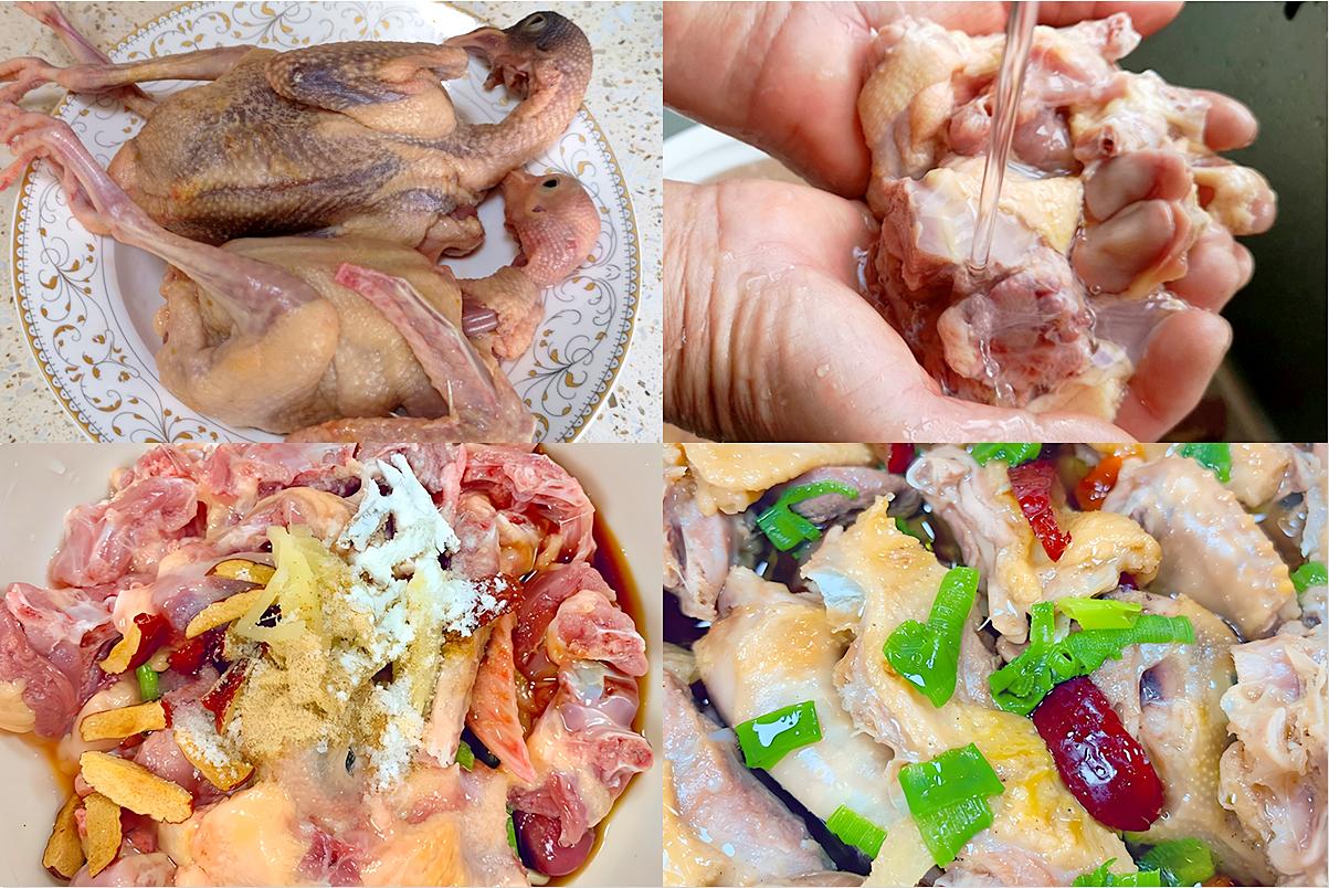 1. 乳鴿處理乾淨,剁成小塊,用清水浸泡15分鐘去血水,瀝乾。