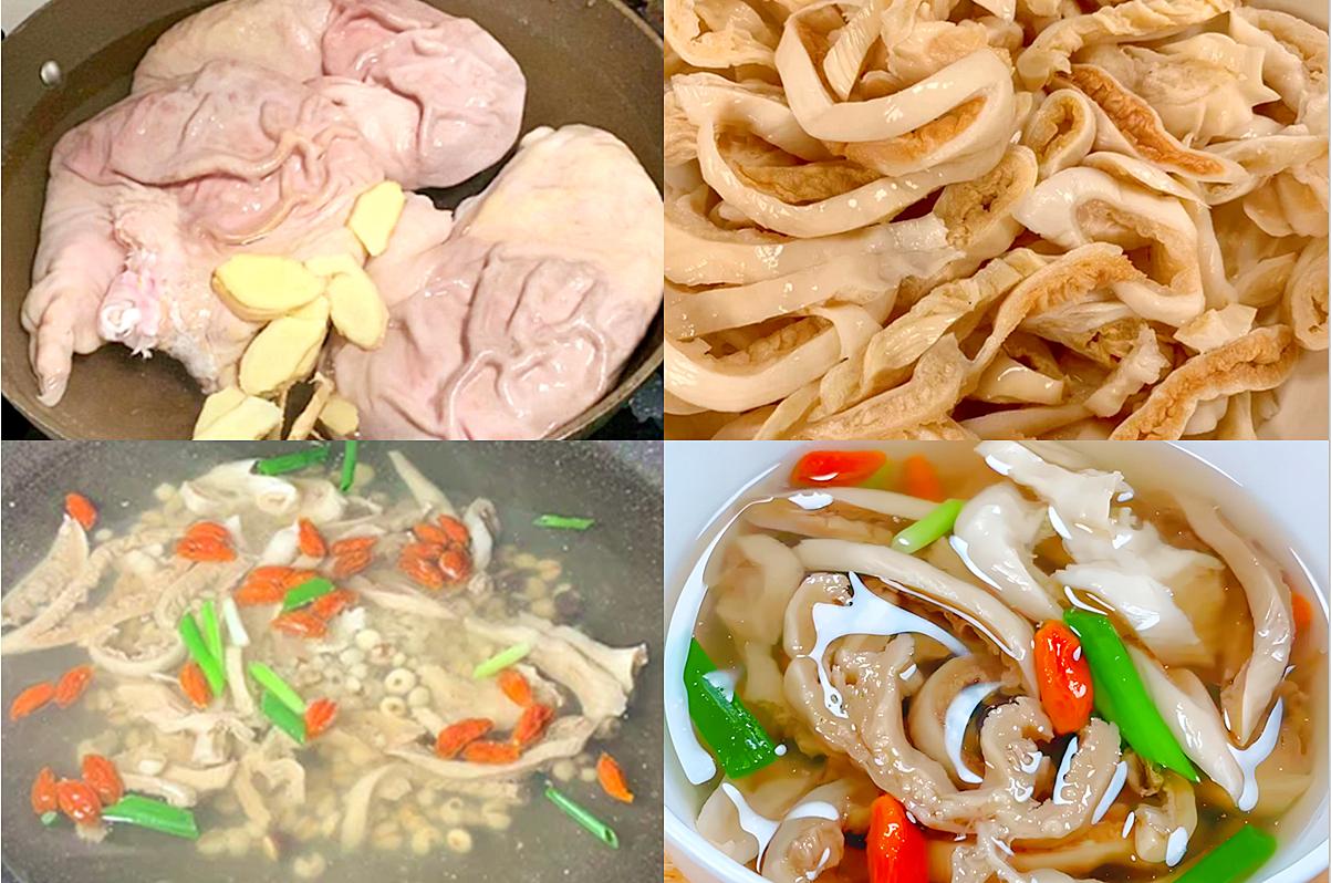1. 豬肚用麪粉和醋反覆搓洗,裏外翻面洗淨,焯水後切成條。