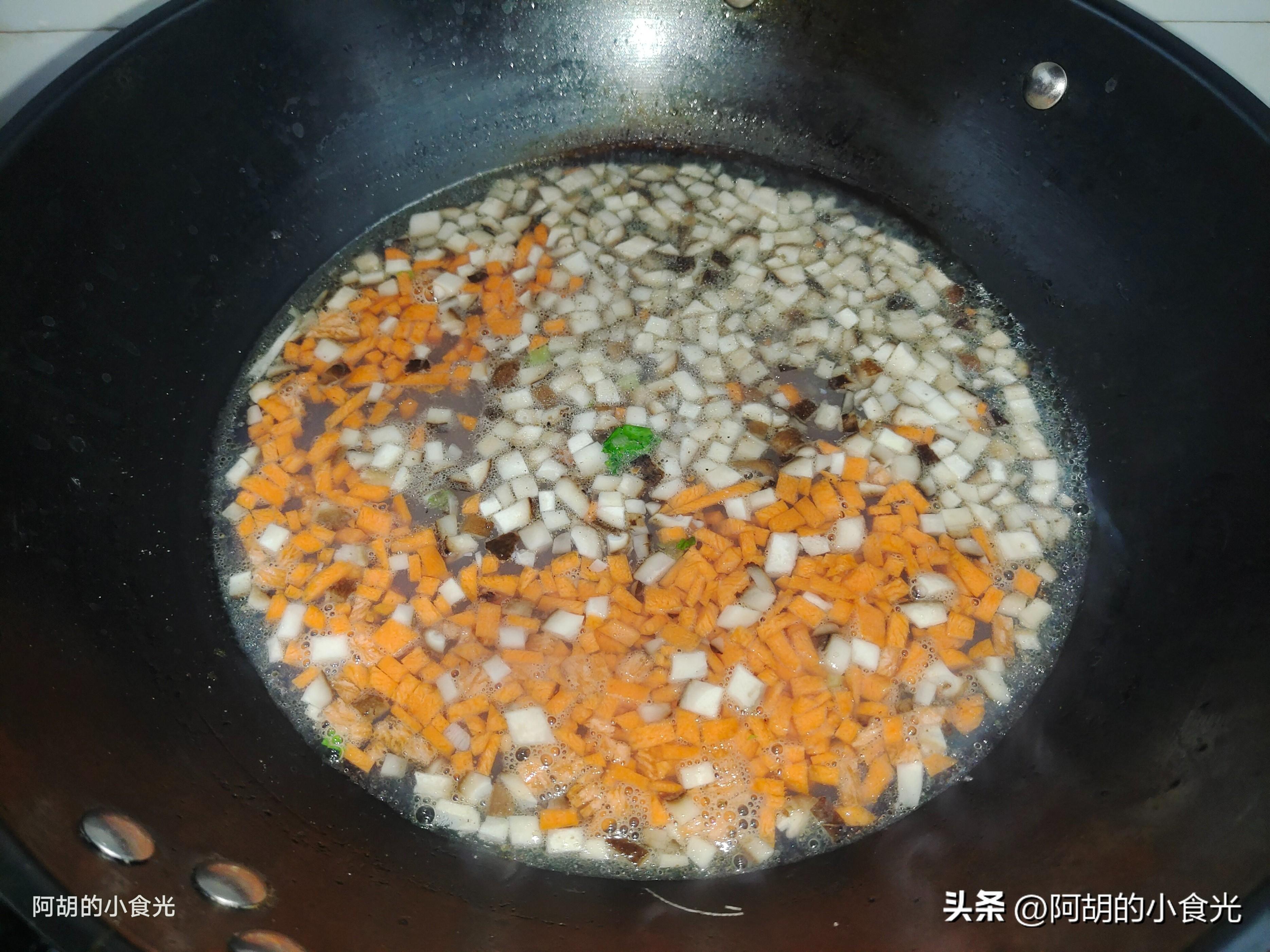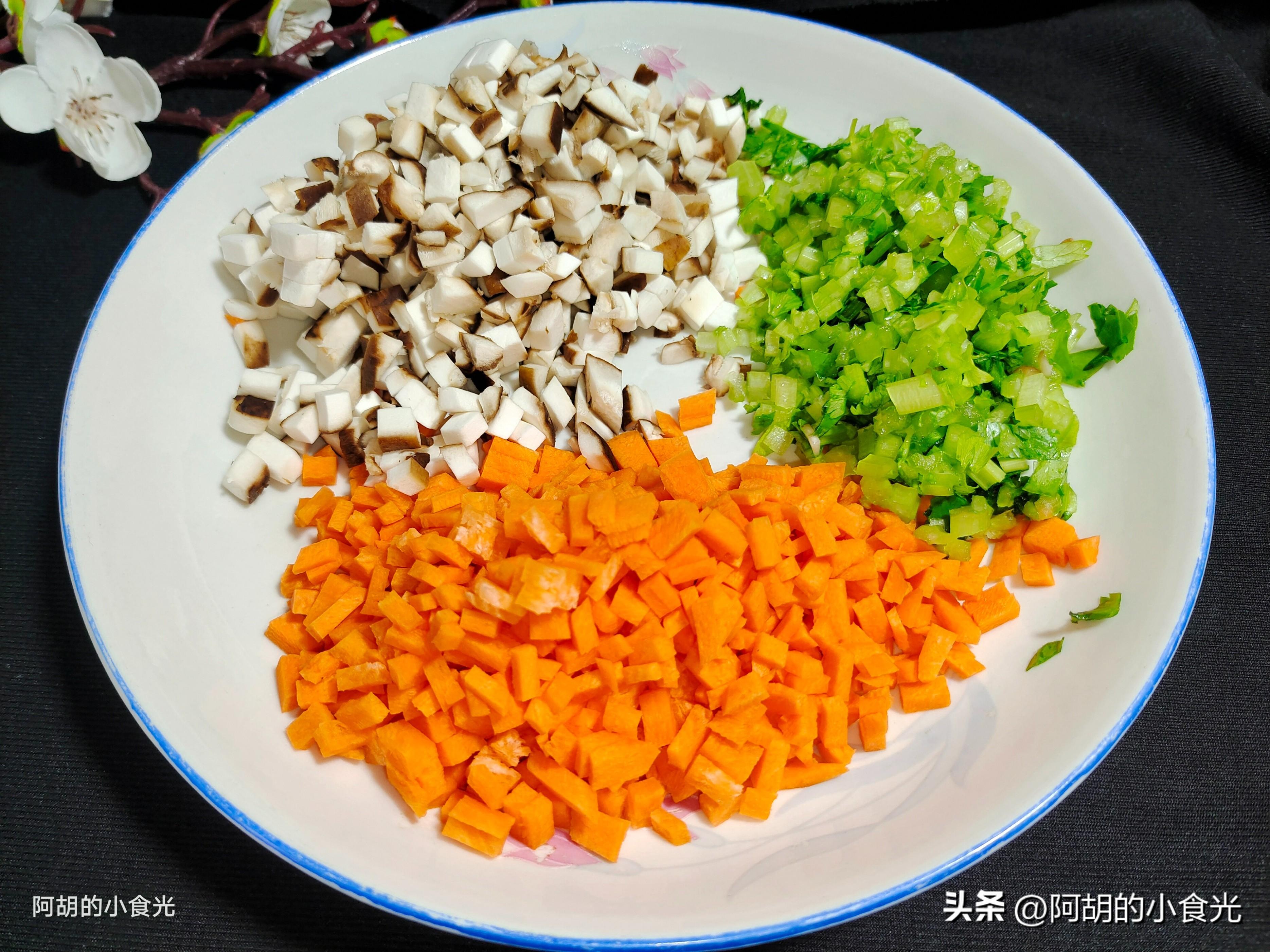 第二步:準備的一下配菜也比較簡單,有鮮香菇3個洗淨後切成小粒備用,一小塊胡蘿蔔也切成小粒待用。還有最主要用來提味的芹菜不能少,準備一棵洗淨後切碎成小粒,注意芹菜葉也不要浪費,一塊切碎即可。