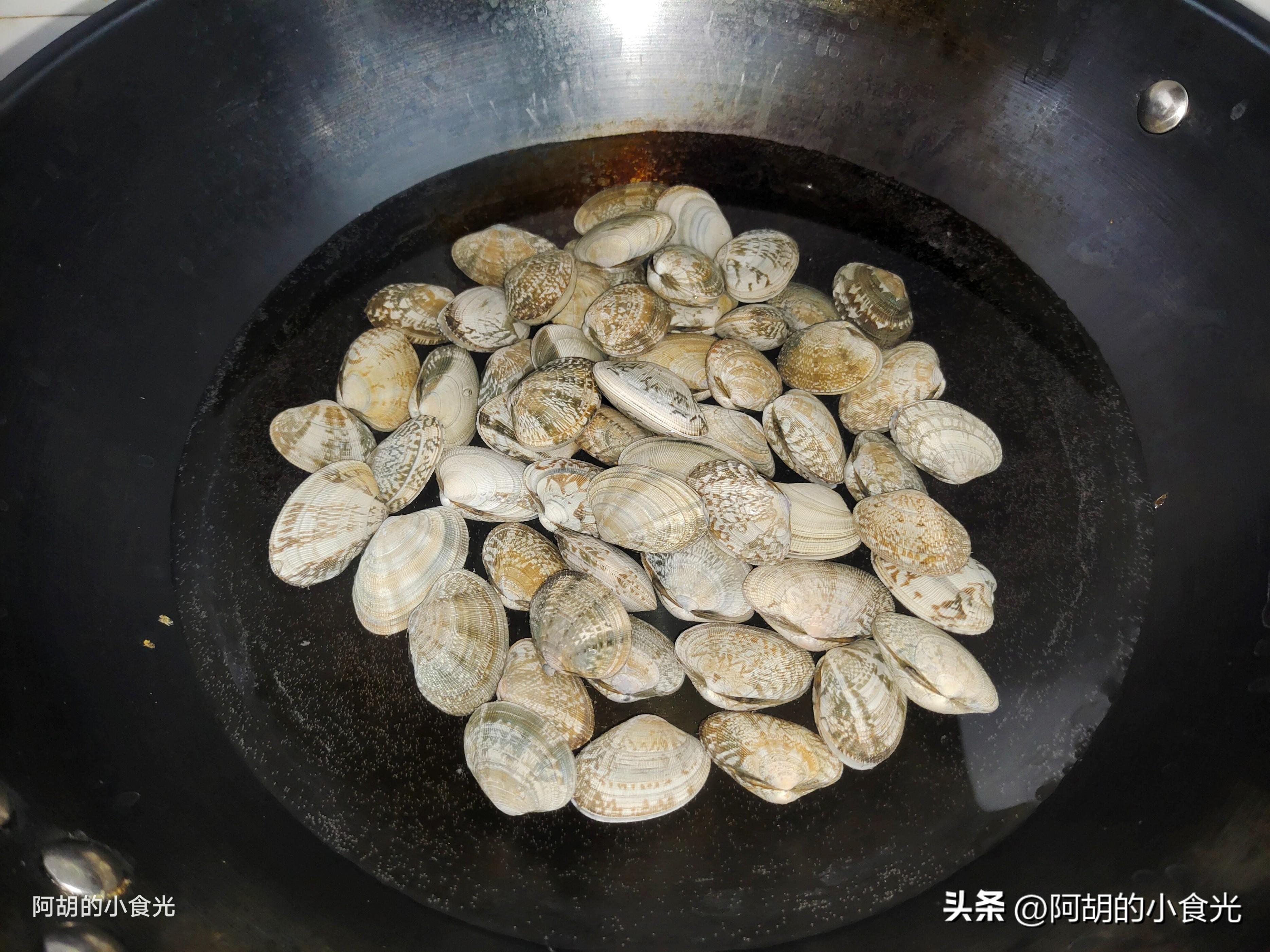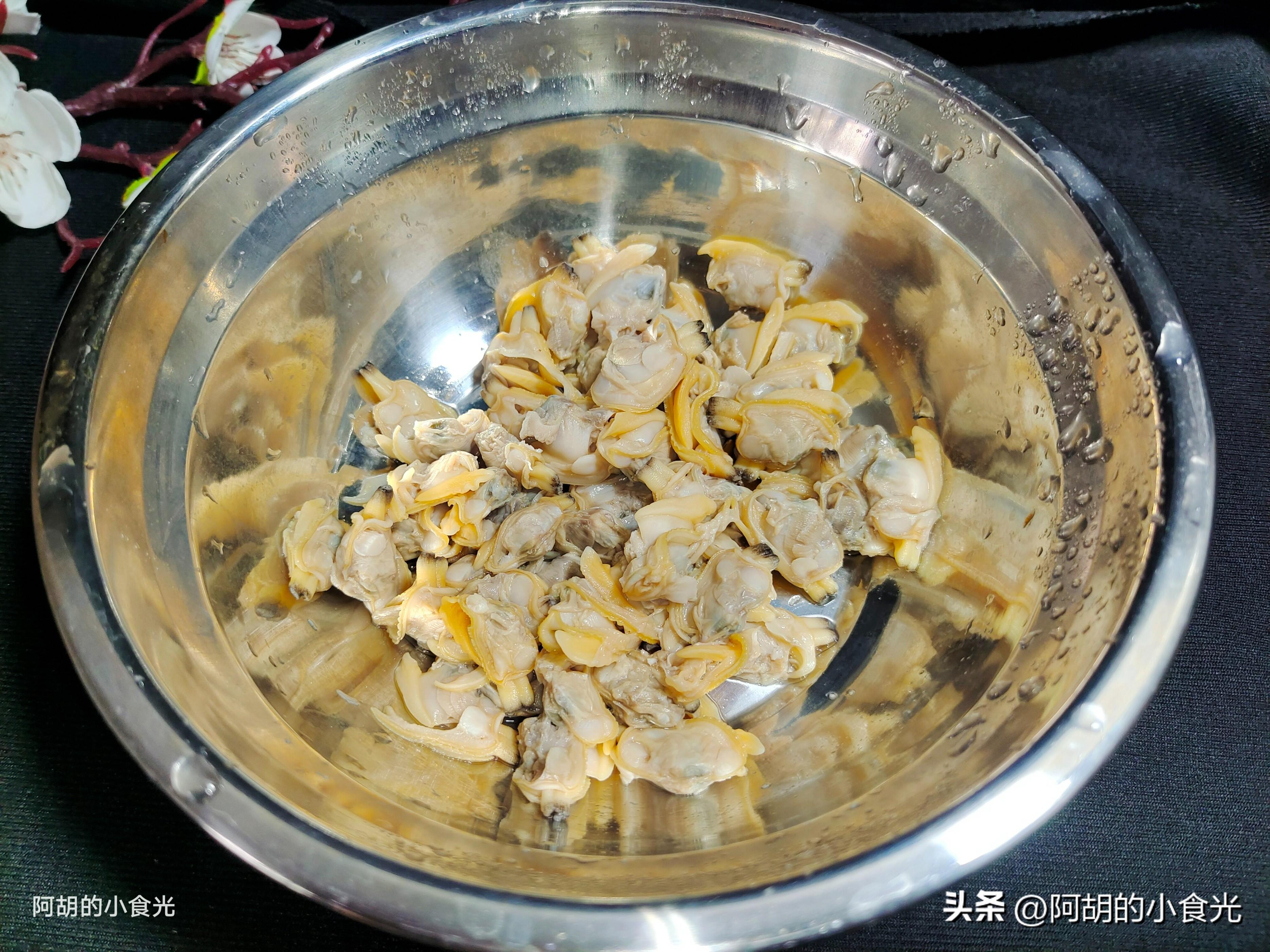 第一步:先來處理花蛤,一定要用鮮活的花蛤,買回來後可以加水和適量的食鹽放在陰暗的地方養一養,讓其吐吐泥沙。而後再充分地淘洗乾淨,涼水下鍋後大火煮至完全開殼。撈出後將花蛤肉剔除出來洗淨待用。剩下的花蛤湯不要浪費,倒出後置於一邊靜置成點一下待用。