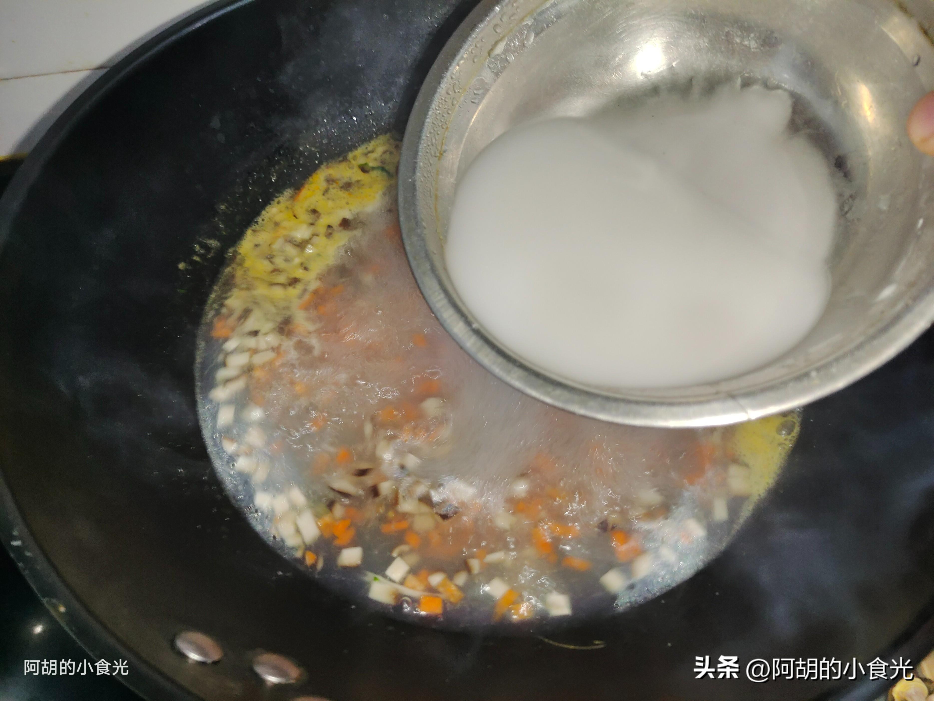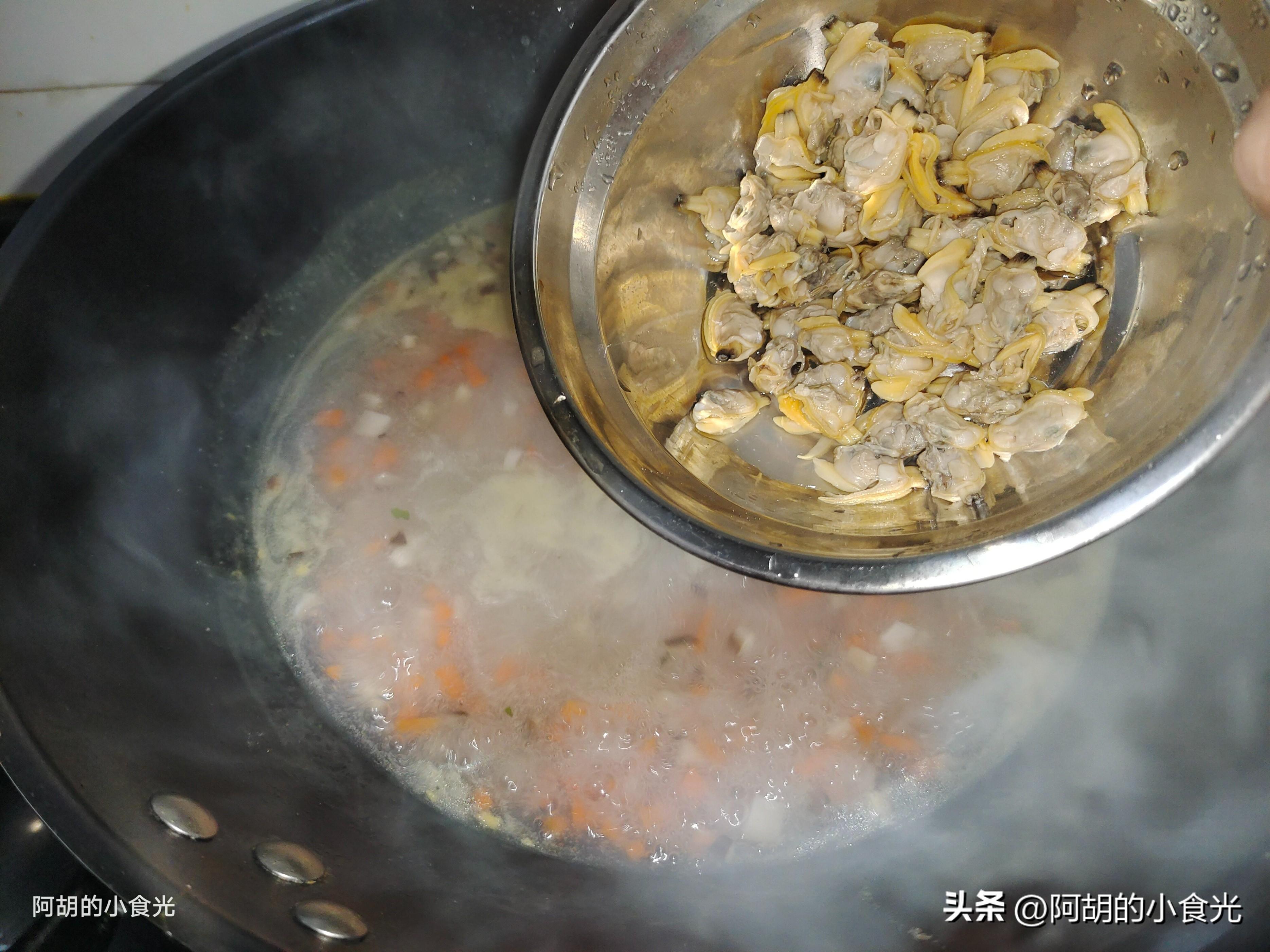 第四步:把第一步中留下的花蛤湯直接衝入鍋中,注意最後的一些沉澱物不要入鍋。將胡蘿蔔丁也倒入鍋中,轉爲大火煮個幾分鐘,調味就加入一些食鹽和白胡椒粉即可。而後用涼水稀釋一些生粉慢慢地淋入鍋中,同時鍋內保持大火用勺子不停地攪拌,直至湯汁呈現“米湯”一樣的濃稠度即可。