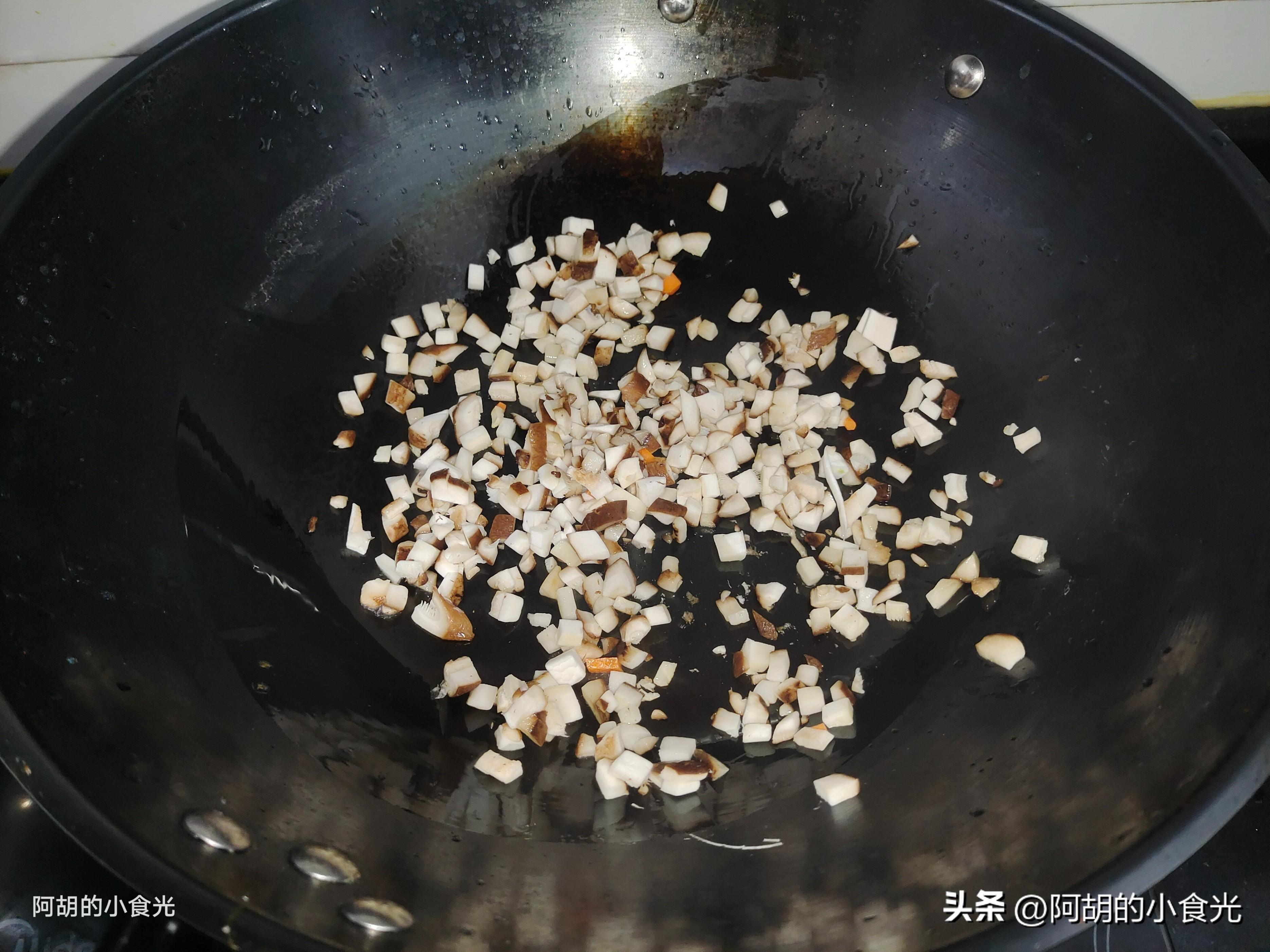 第三步:主料和配菜都備好後就可以開火烹飪了。先小火把鍋烘乾,淋入一些花生油燒熱,只要把香菇丁倒入鍋中小火炒幾下即可。不太喜歡鮮香菇的一些土腥味,所以這裏就先用熱油炒了一炒,幫助去除一些異味。