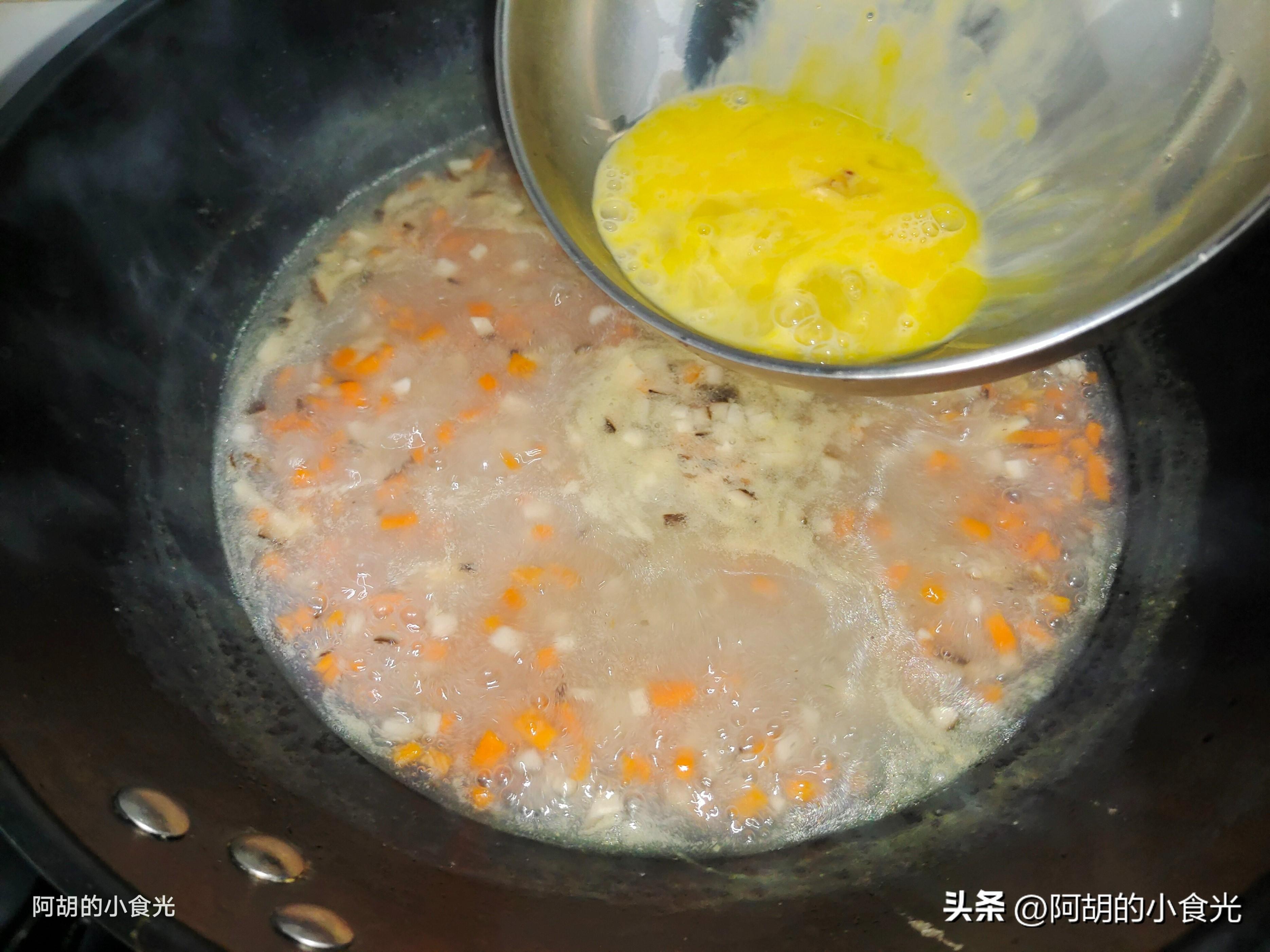 第五步:取出花蛤肉也倒入鍋中,攪拌均勻後再打散一個雞蛋淋入鍋中,一邊淋入一邊用勺子攪拌,讓蛋液呈現蛋花狀即可。