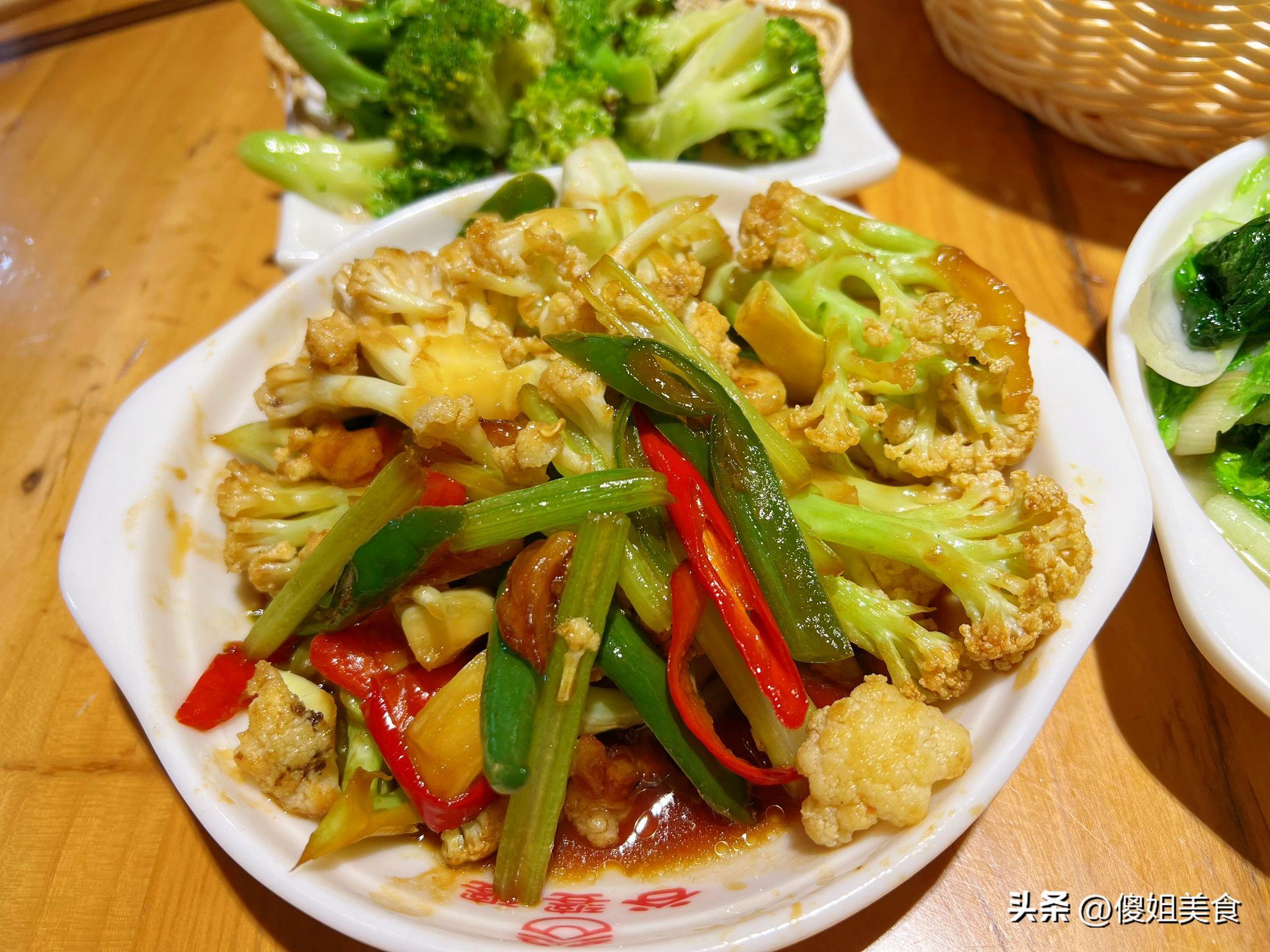 另一盤是我從小就最喜歡的炒花菜。花菜炒得火候正好,既斷生又保留了適口的脆感,菜朵上均勻地掛着一層薄薄的、亮晶晶的芡汁。裏面配了青椒和紅椒絲,紅的鮮豔,綠的清脆,和乳白的花菜搭配在一起,色彩一下子就被點亮了,看着就讓人食慾大開。