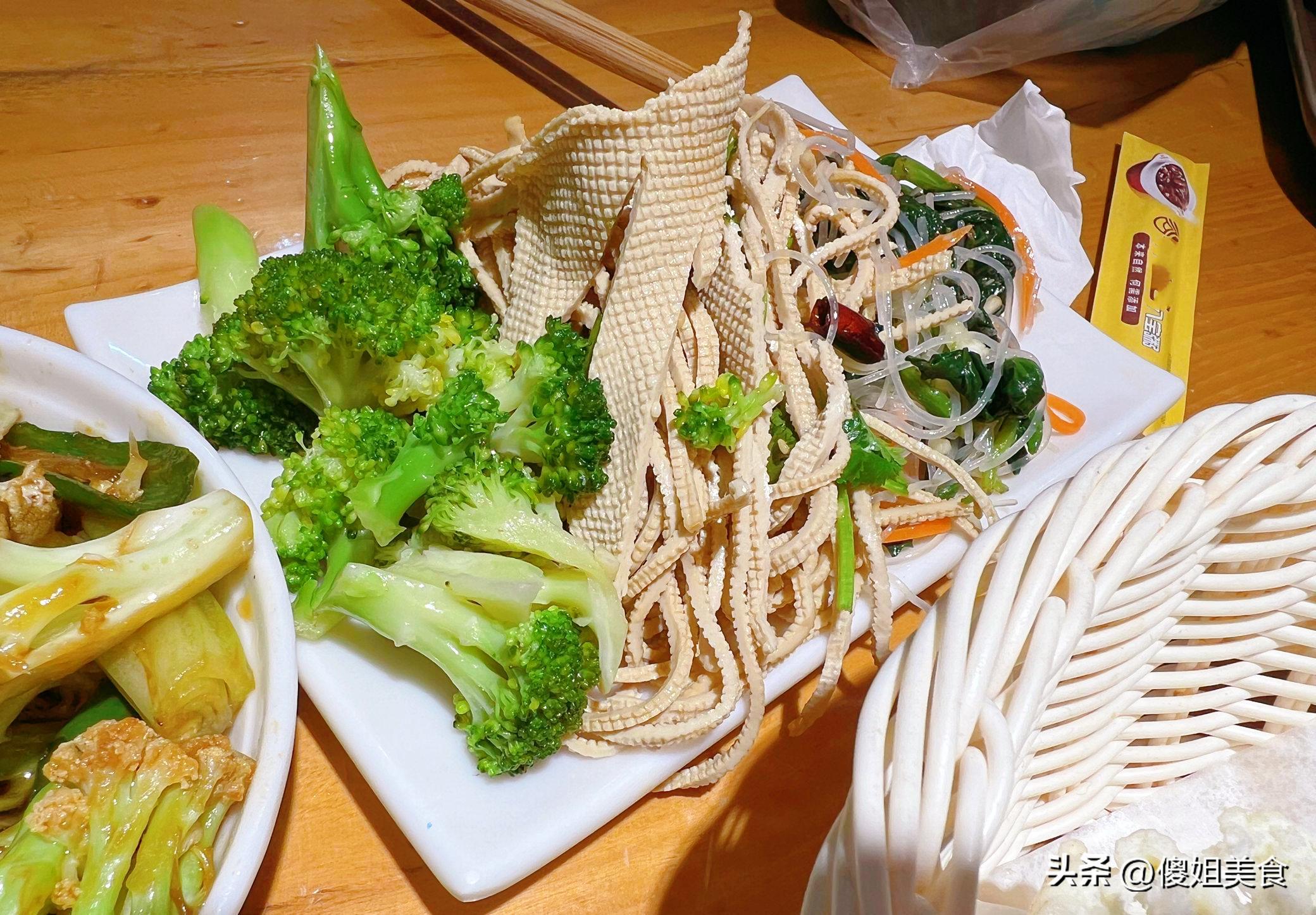 還有一道涼拌菜,豆腐皮,切成細絲,泡軟了的粉絲晶瑩剔透,還有焯過水碧綠的菠菜、橙紅的胡蘿蔔絲。最讓人驚喜的是,裏面還“藏”了幾朵焯熟的西蘭花,像翠綠的小樹冠。這一盤子,五彩斑斕的,用簡單的香油、醋和鹽一調,各種食材不同的口感在嘴裏交匯,脆的、軟的、韌的、滑的,清爽開胃,正好中和炒菜的溫熱。