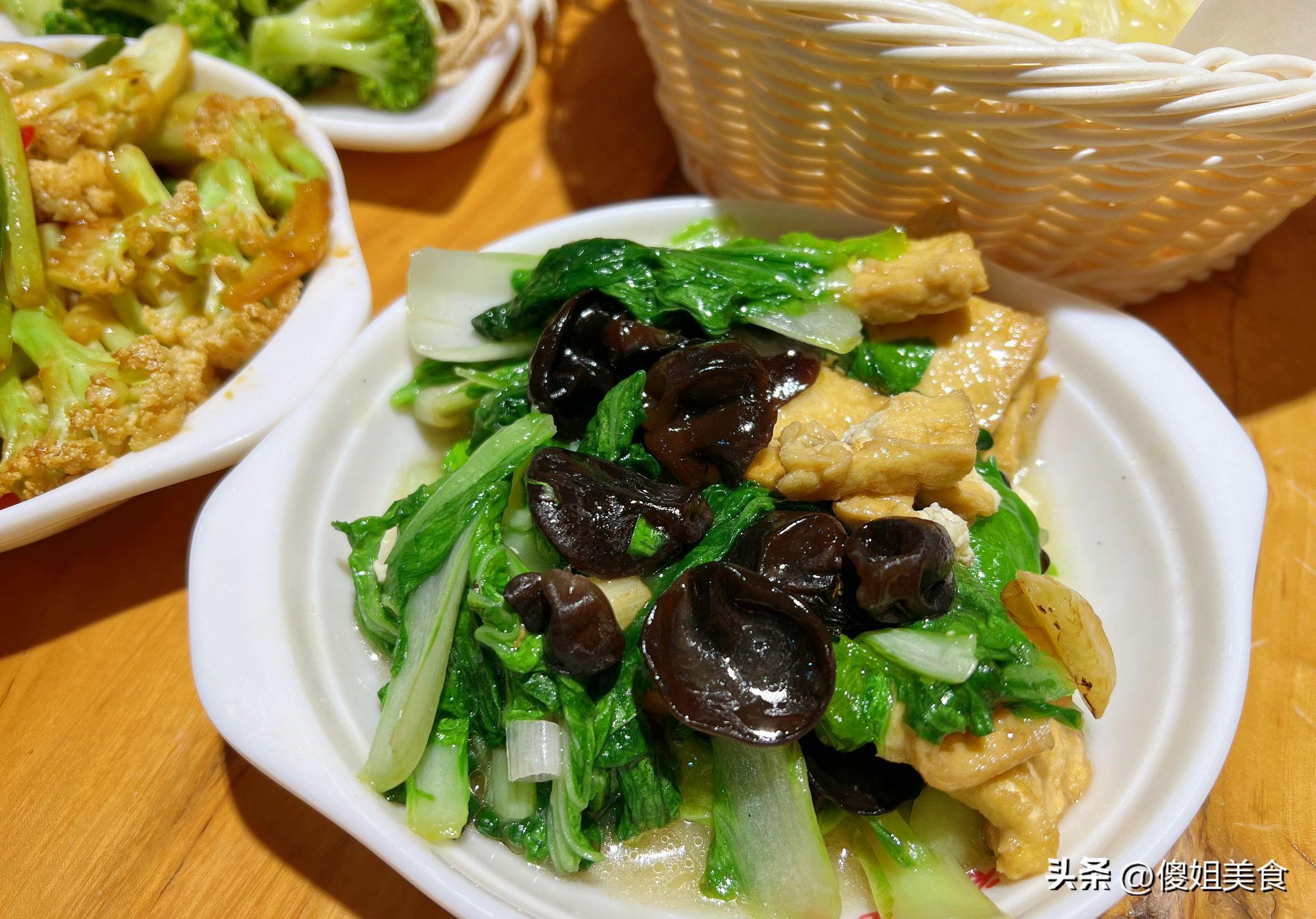 先看這一盤,是小白菜炒豆腐。嫩綠的小白菜,配着雪白軟嫩的豆腐塊,裏面還零星點綴着幾朵黑色的木耳。清清白白的一盤,油光不大,看着就清爽。夾一筷子,小白菜還帶着脆生的口感,豆腐吸飽了菜汁,又嫩又入味,木耳咯吱咯吱的,給軟滑的菜餚添了幾分趣味。早上起來,腸胃還沒完全甦醒,這第一口清淡爽口的家常炒菜,真是熨帖。