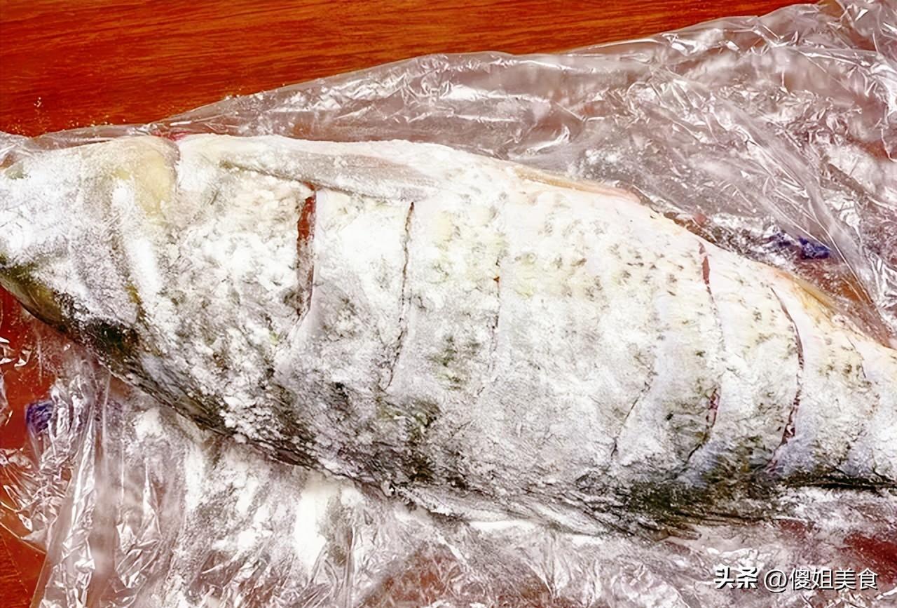 第二步:把魚身上薄薄地拍上一層面粉,兩面都要拍勻,看到魚身上有一層淡淡的白粉就可以了,不用太厚。這個步驟的妙處在於:麪粉能吸走魚皮表面多餘的水分,形成一層保護膜,這樣煎的時候就不會破皮,而且能鎖住魚肉內部的汁水。