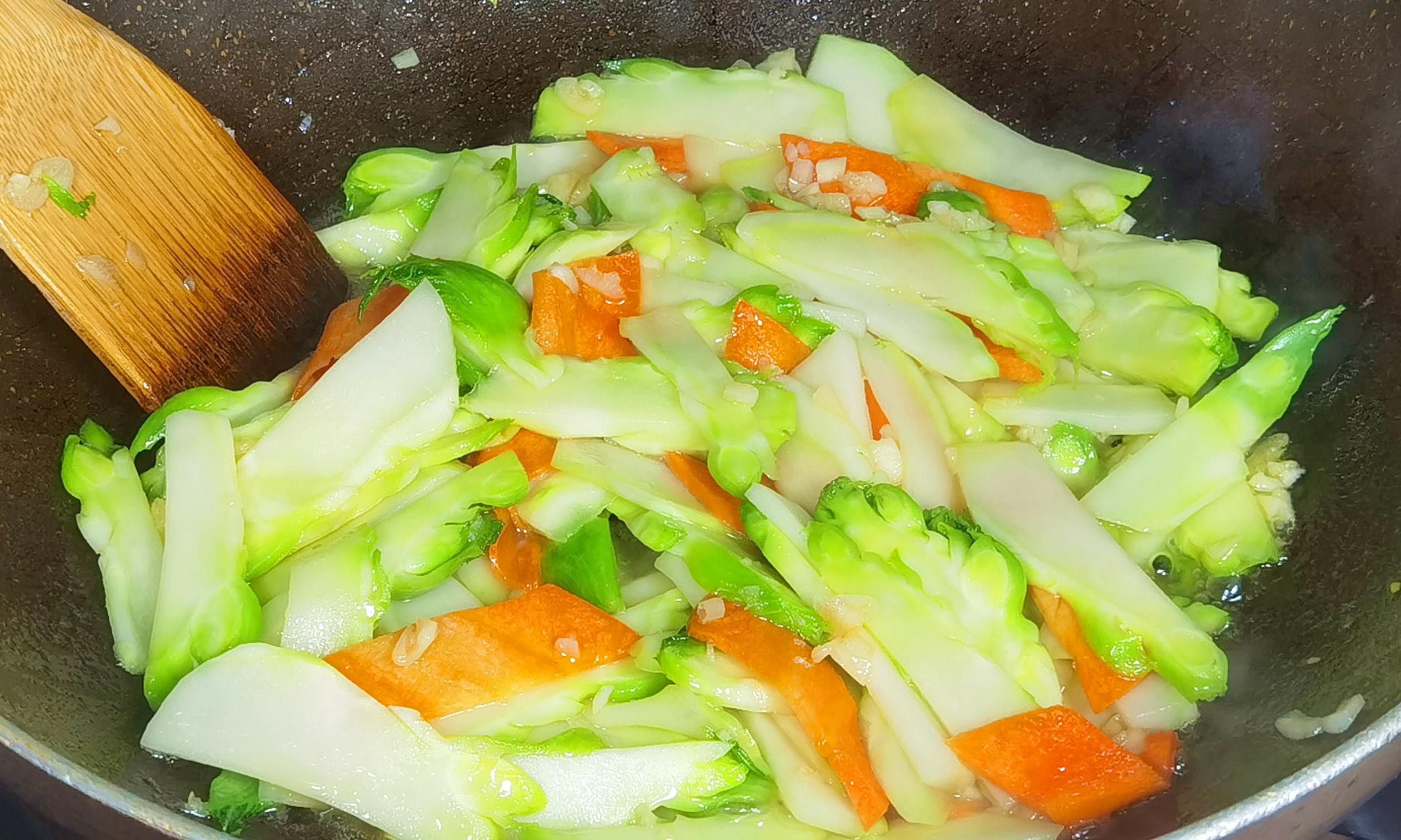 轉大火,把焯好水、瀝乾的兒菜和胡蘿蔔片一起倒進鍋裏。快速翻炒幾下,讓蒜油均勻裹住每一片菜。接着加鹽調味(如果之前焯水放過鹽,這時要少放一點),喜歡的話可以加一小撮糖提鮮。